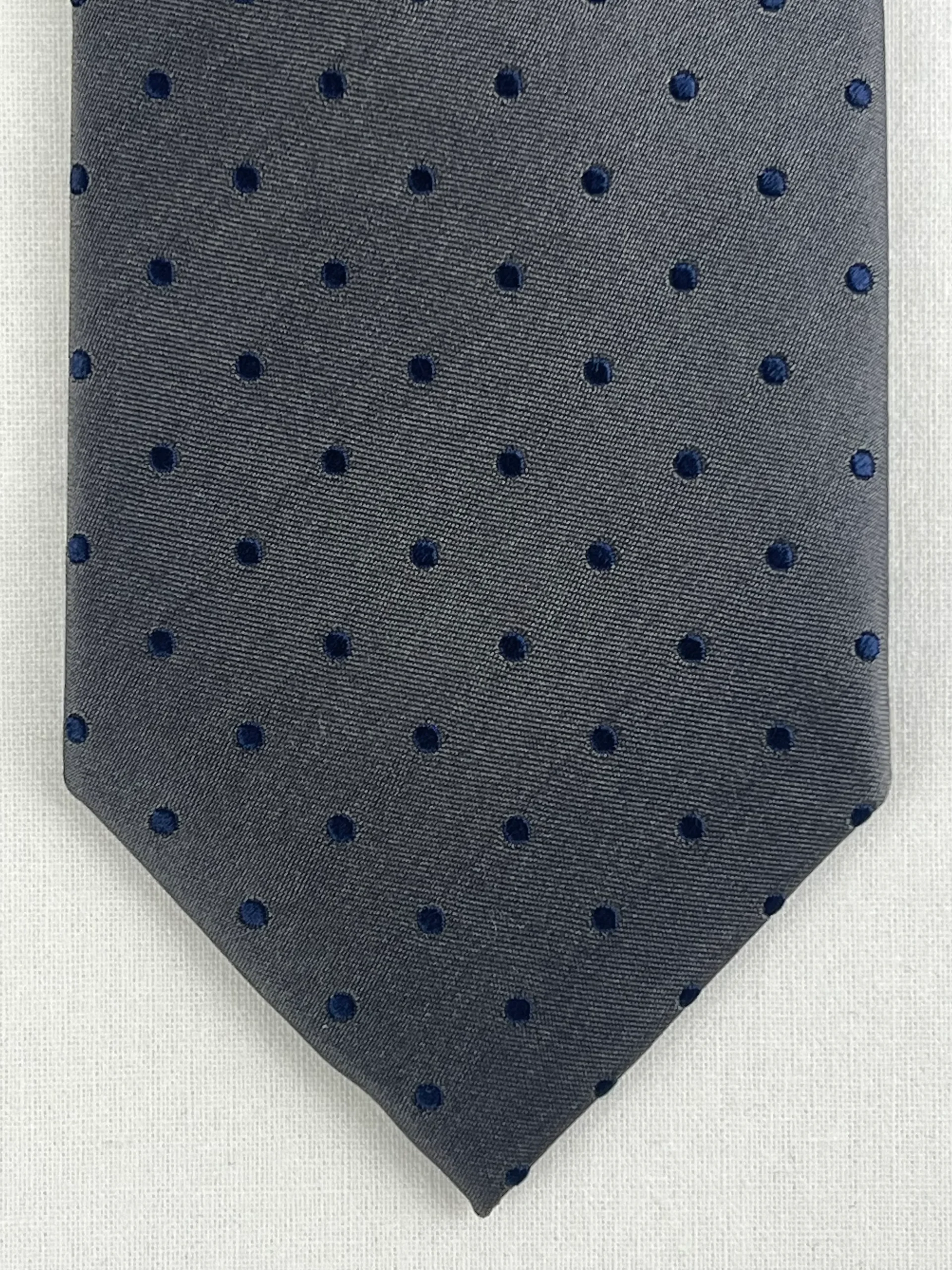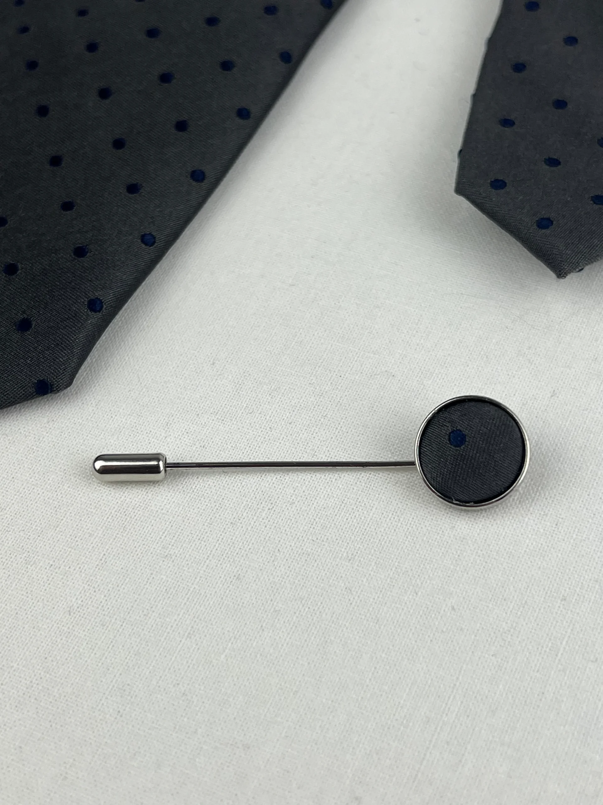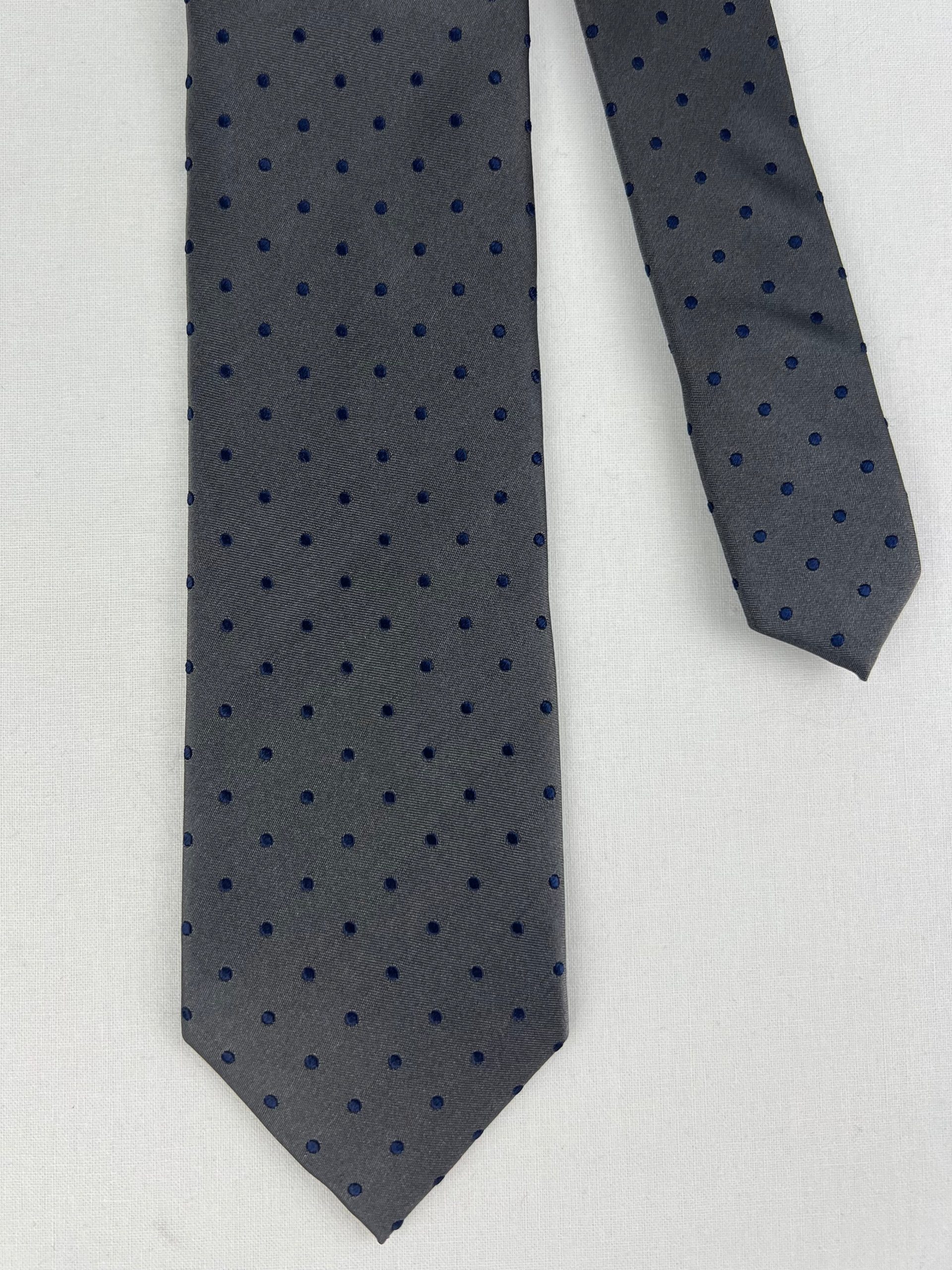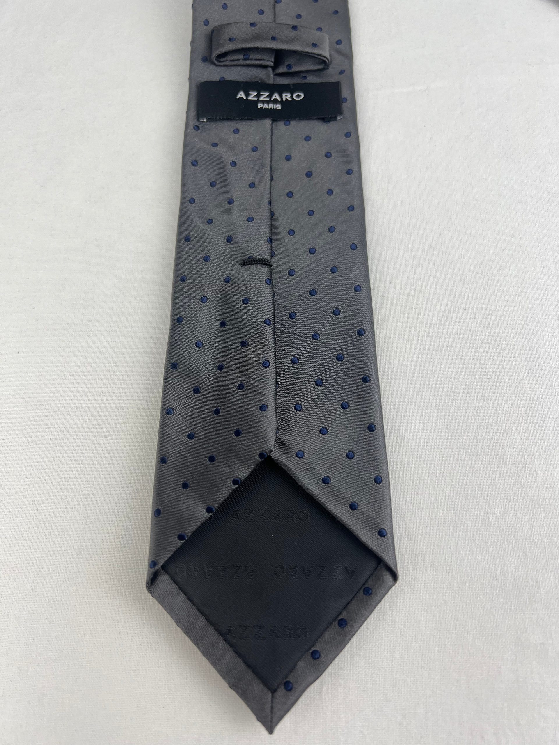 Cravate et épingle de la marque Azzaro. Cravate à pois bleu marine. Matières : 100 % Soie