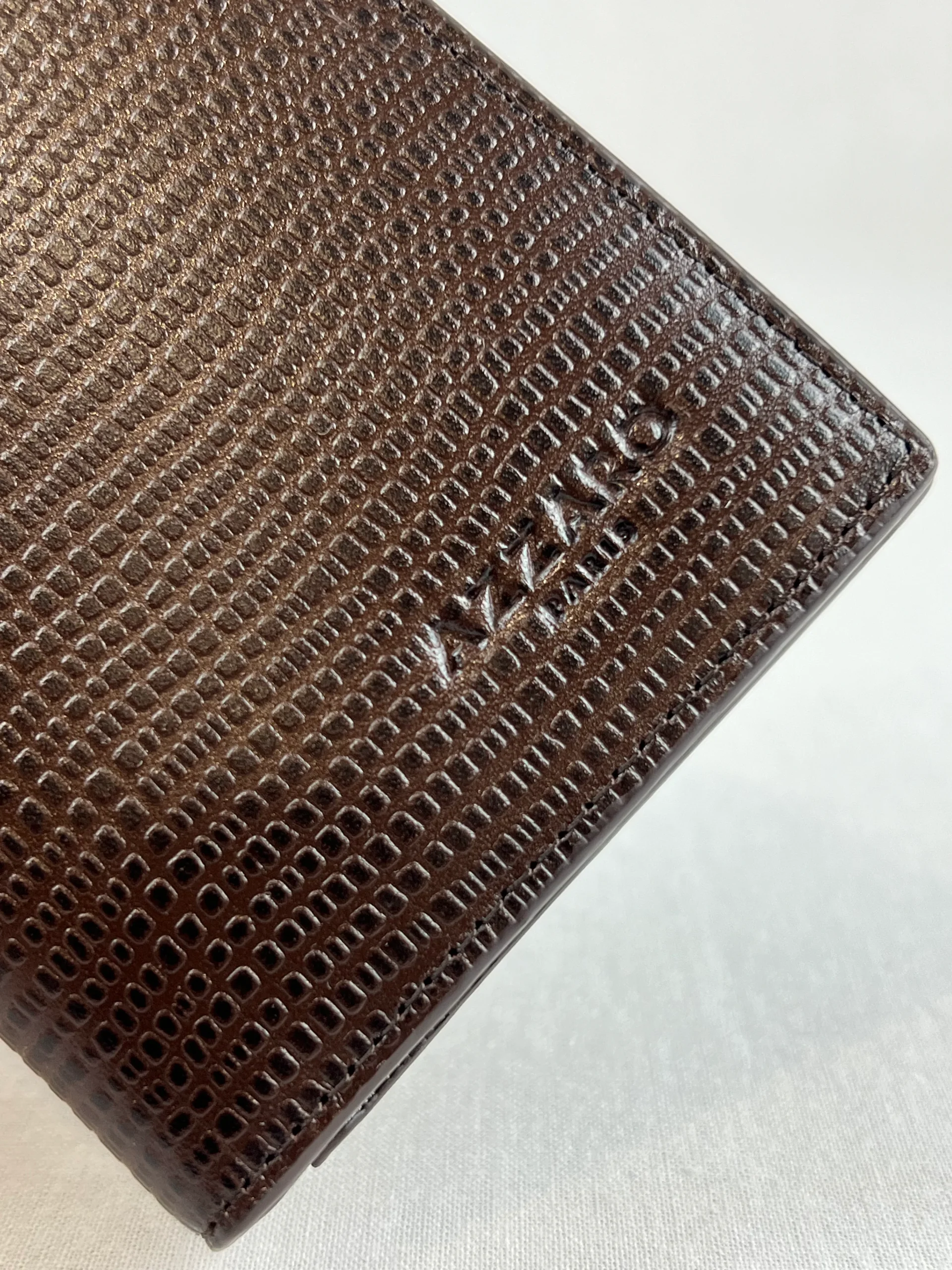Portefeuille de la marque Azzaro Ce modèle compact est doté de trois fentes pour cartes, d’une poche, d’un compartiment pour carte d’identité ou permis, d’une poche zippée pour la monnaie, ainsi que d’un grand compartiment pour billets. Une pochette de protection est fournie avec ce portefeuille. Matières : 100% Cuir de Vachette