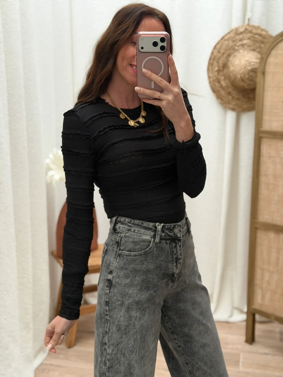 Julie mesure 1,70m et porte une taille S.