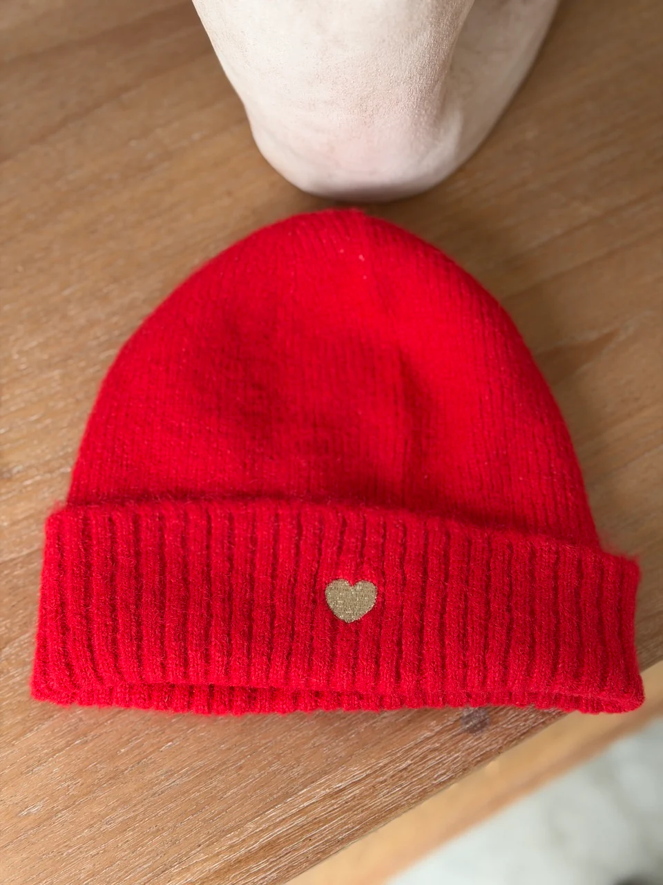 Bonnet avec petit coeur. Elastique. Coloris : Rouge et coeur or. Existe en différents coloris. Composition : 59% Polyester recyclé; 21% nylon; 11% Polyester; 8% Laine; 1% Spandex.