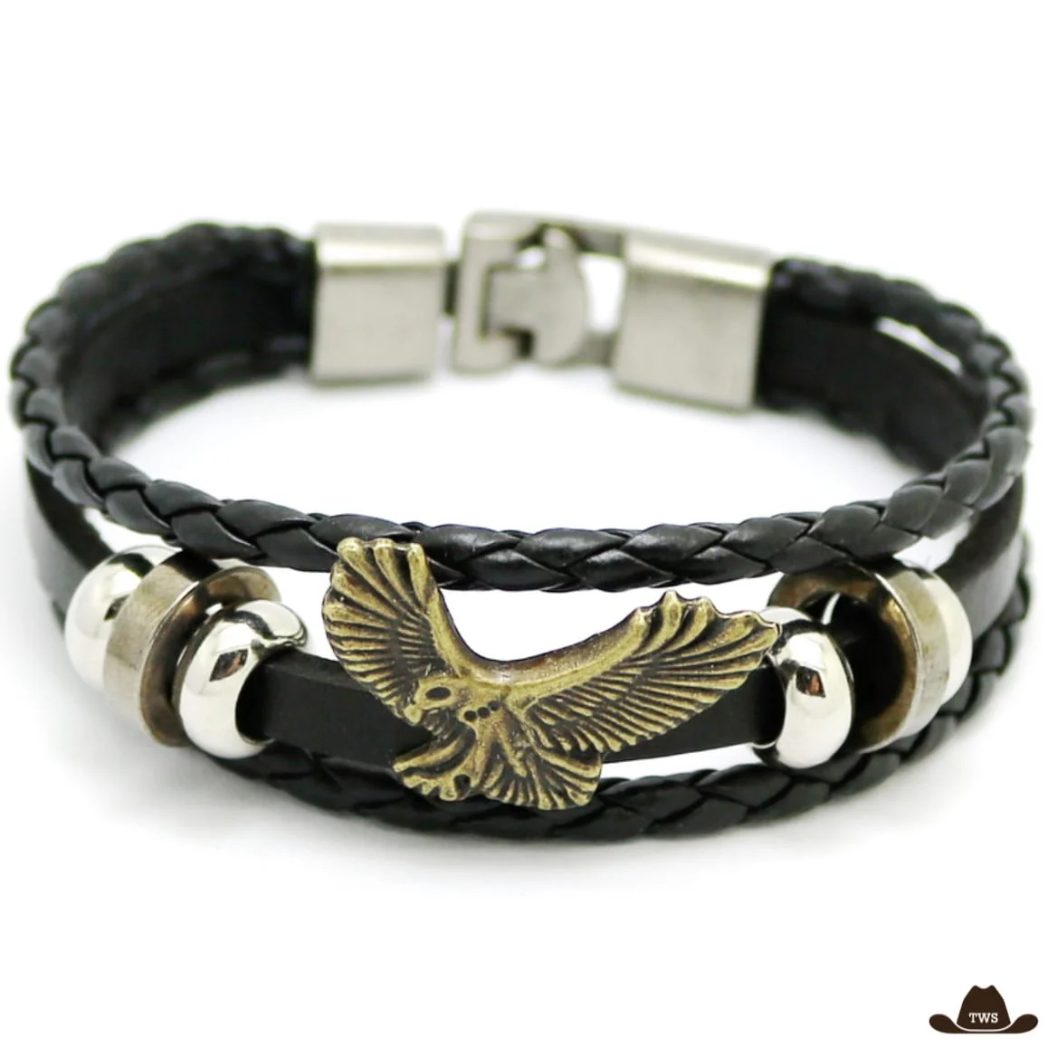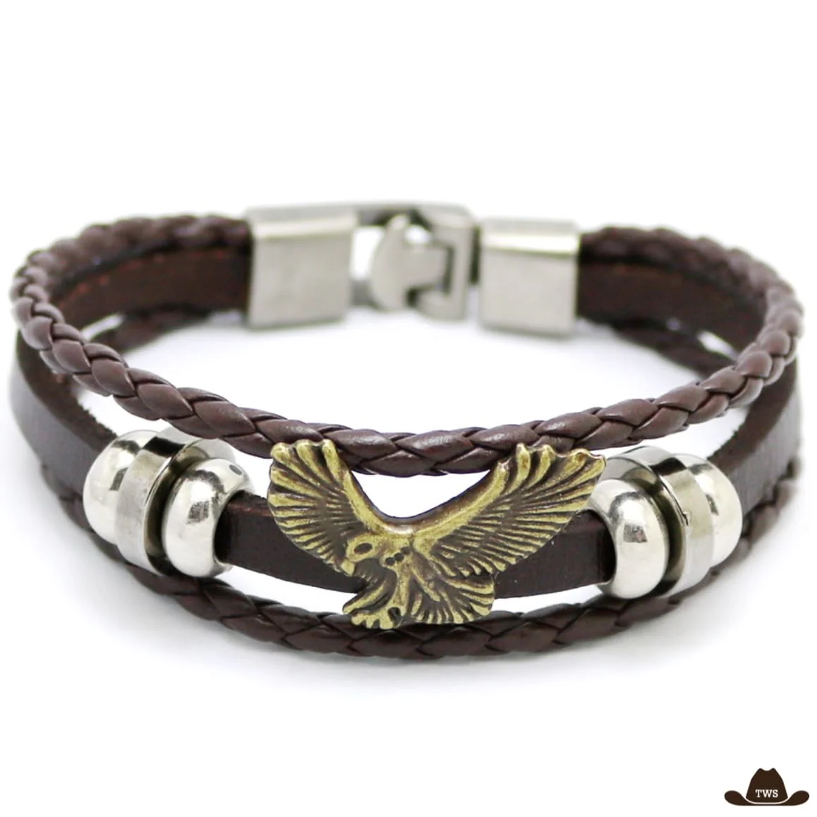 Le bracelet en cuir Aigle met en avant avec élégance et authenticité le style western. Conçu en cuir véritable de qualité supérieure, il se distingue par sa représentation de l’aigle royal, symbole des États-Unis et son cuir tressé.