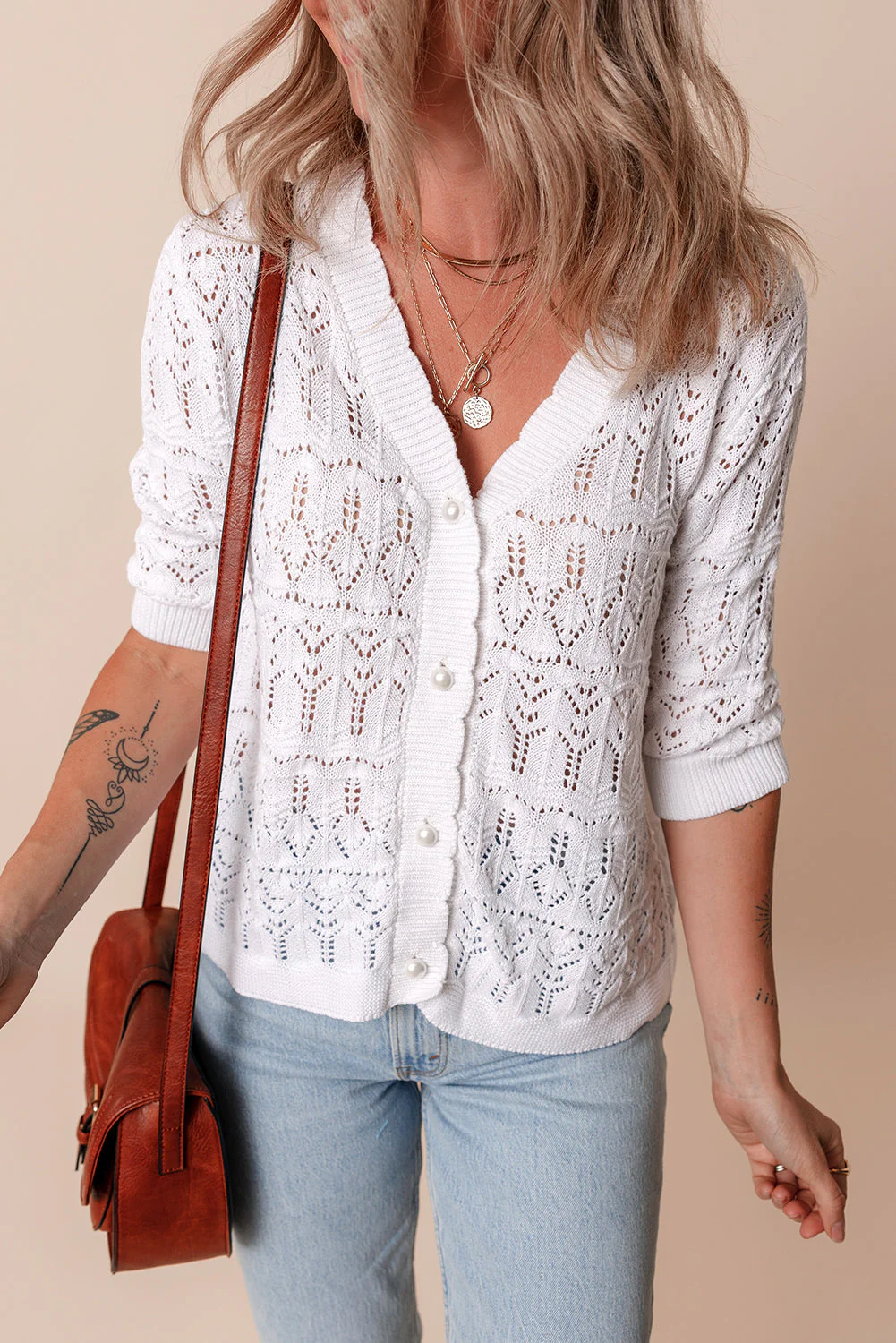 Style élégant avec col en V intemporel et charmant détail creux. Diverses options de style avec devant boutonné. Pulls et pulls Cardigans > Pulls à manches courtes Matière : 55 % Acrylique + 45 % Coton Couleur : Blanc Encolure : Col en V Silhouette : Droite Occasion : Quotidienne Motif : uni Longueur des […]