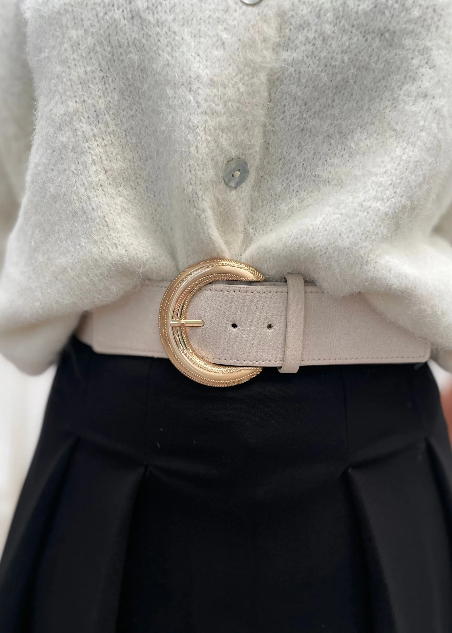 Ceinture élastique. Réglable. Boucle doré. Coloris : Beige Existe en différents coloris. Mesures : 84cm x 5cm Synthétique.