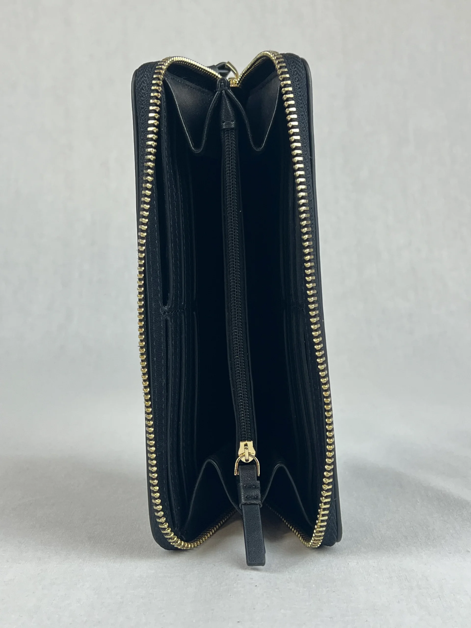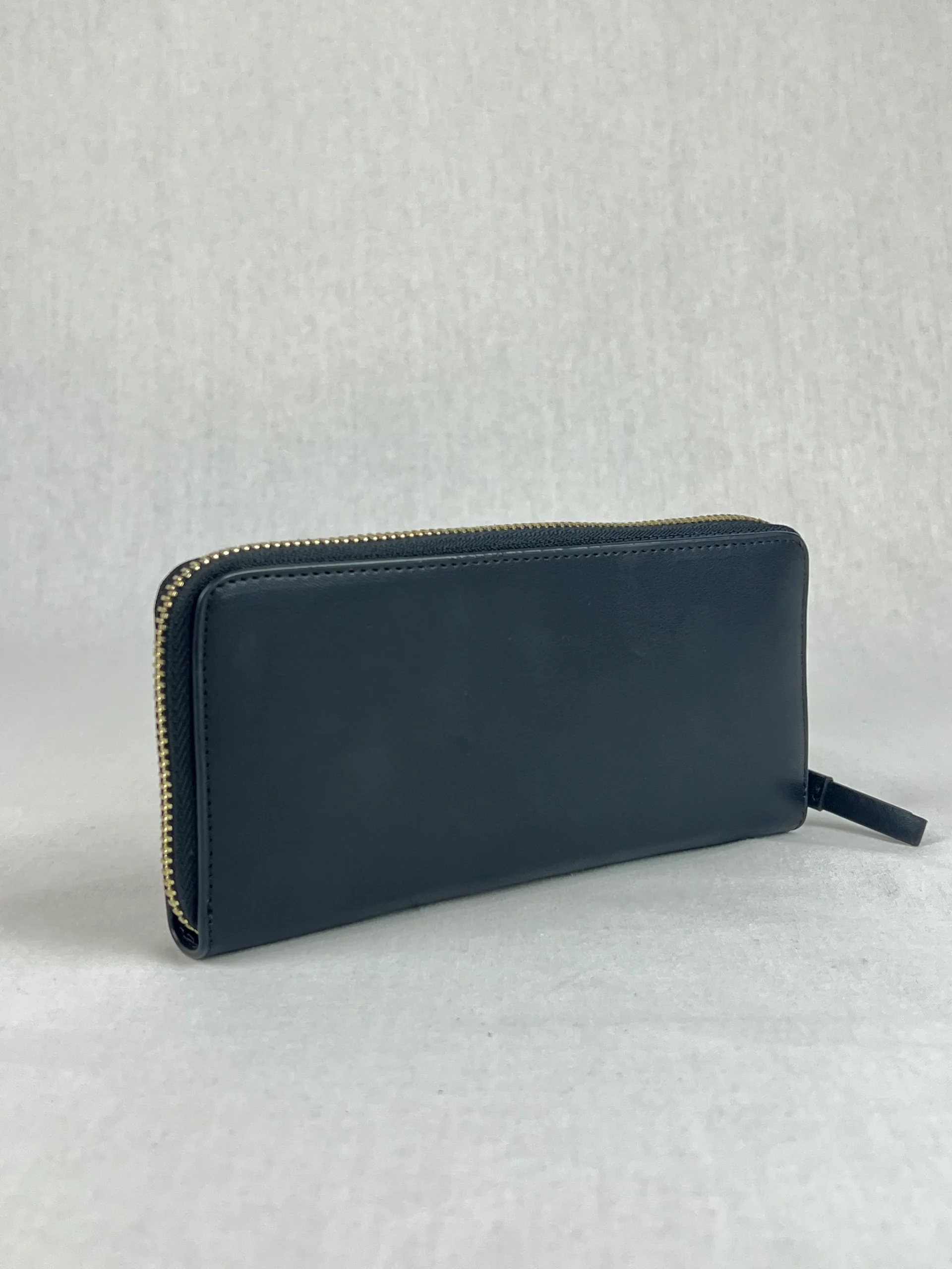 Ce modèle plat, équipé d’une fermeture à glissière, dévoile un intérieur avec deux grands compartiments, une poche zippée pour la monnaie, ainsi que douze emplacements pour cartes de crédit.