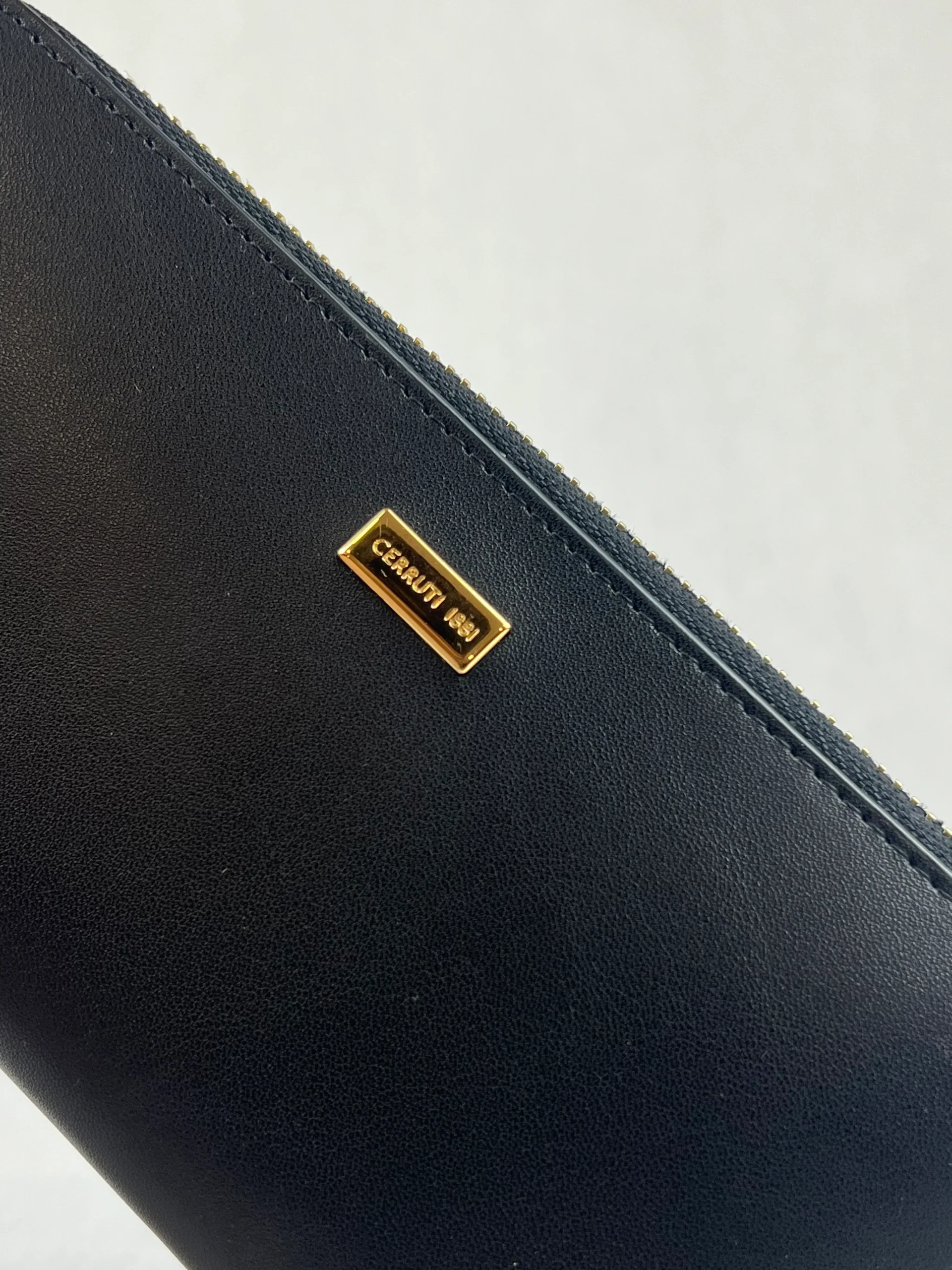 Portefeuille de la marque Cerruti modèle Casta Ce modèle plat, équipé d’une fermeture à glissière, dévoile un intérieur avec deux grands compartiments, une poche zippée pour la monnaie, ainsi que douze emplacements pour cartes de crédit. Une pochette de protection est fournie avec ce portefeuille. Matières : 100% Cuir