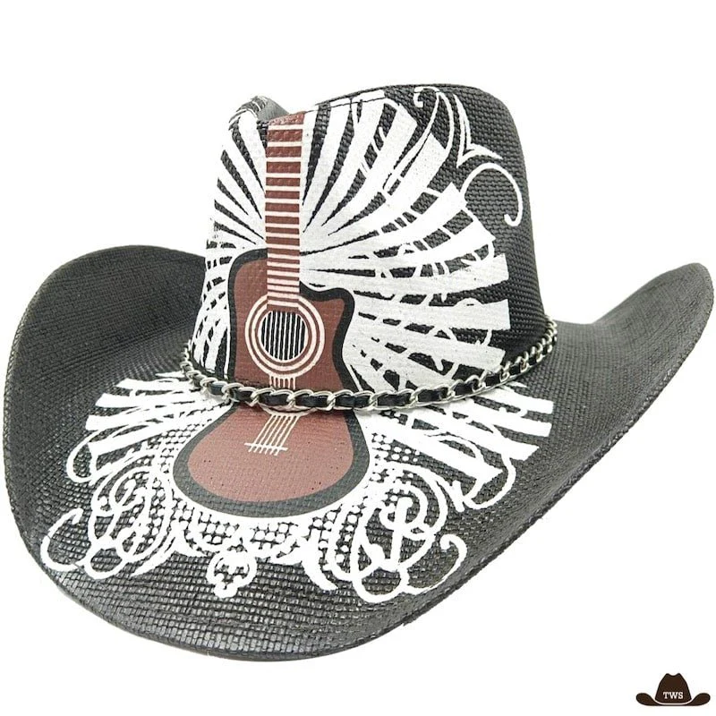 Sa couleur noire élégante au motif de guitare ajoute une touche de sophistication, tandis que son large bord offre une protection contre le soleil et les éléments.