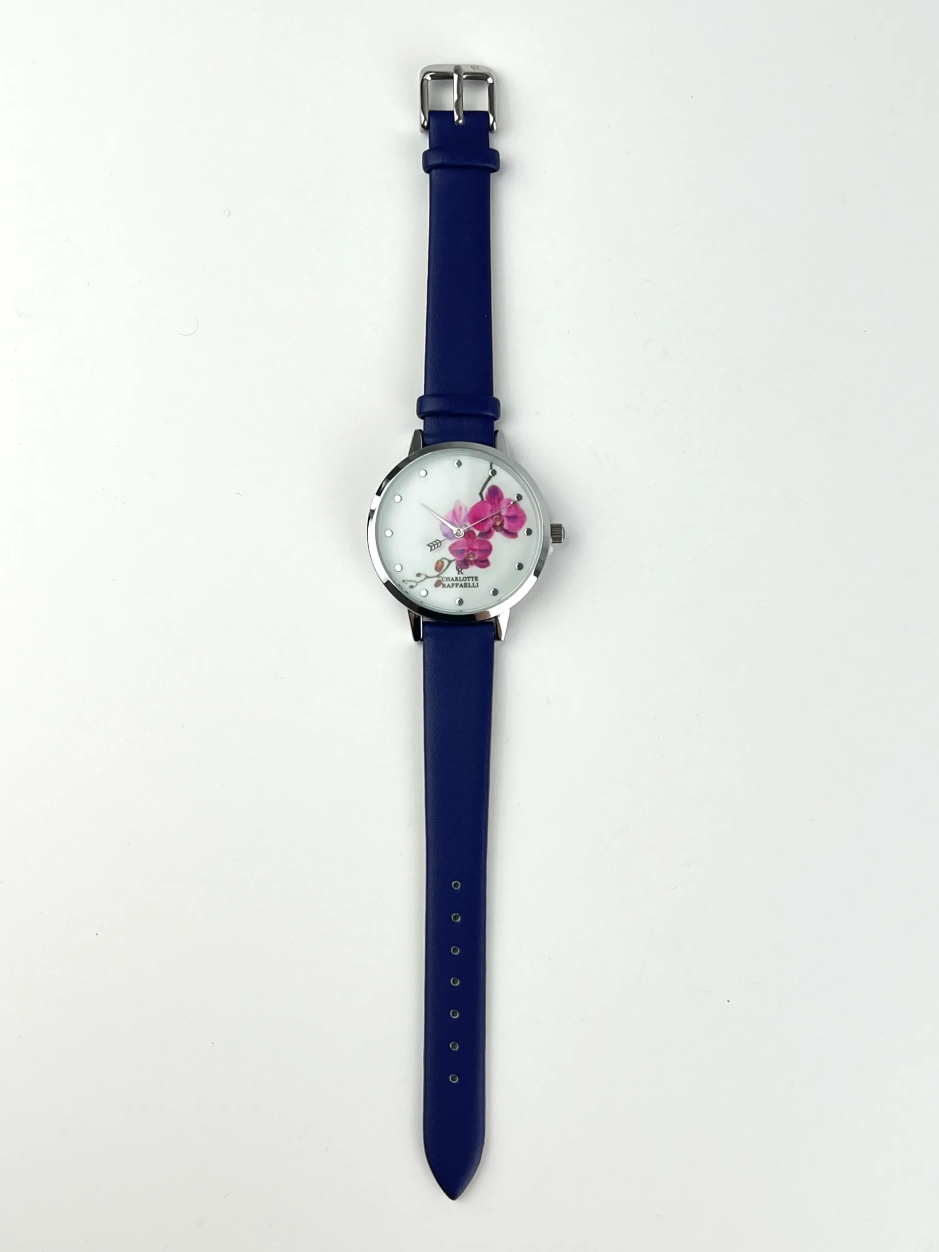 Montres de la marque Charlotte Raffaelli. Montre avec imprimé orchidée. Bracelet : 100 % cuir Cadran : Acier inoxydable
