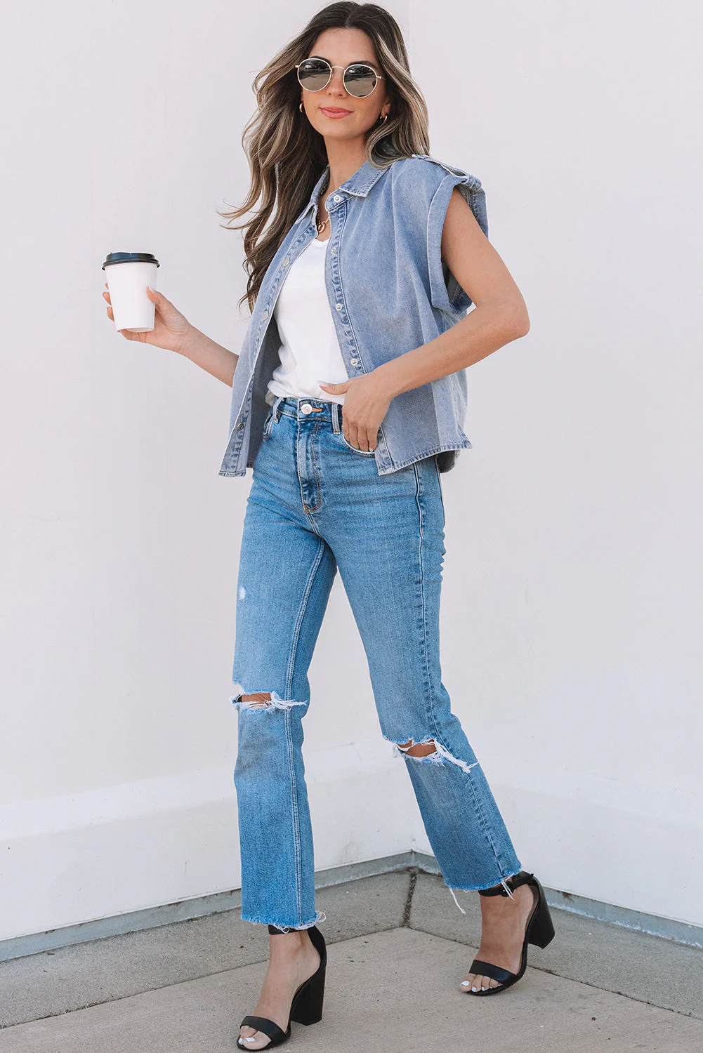 La chemise en jean Pinup à manches courtes repliées est à la fois classique et tendance, avec ses élégantes manches courtes repliées et sa coupe courte. Parfaite en toute occasion, cette chemise est désormais en promotion pour l’été.