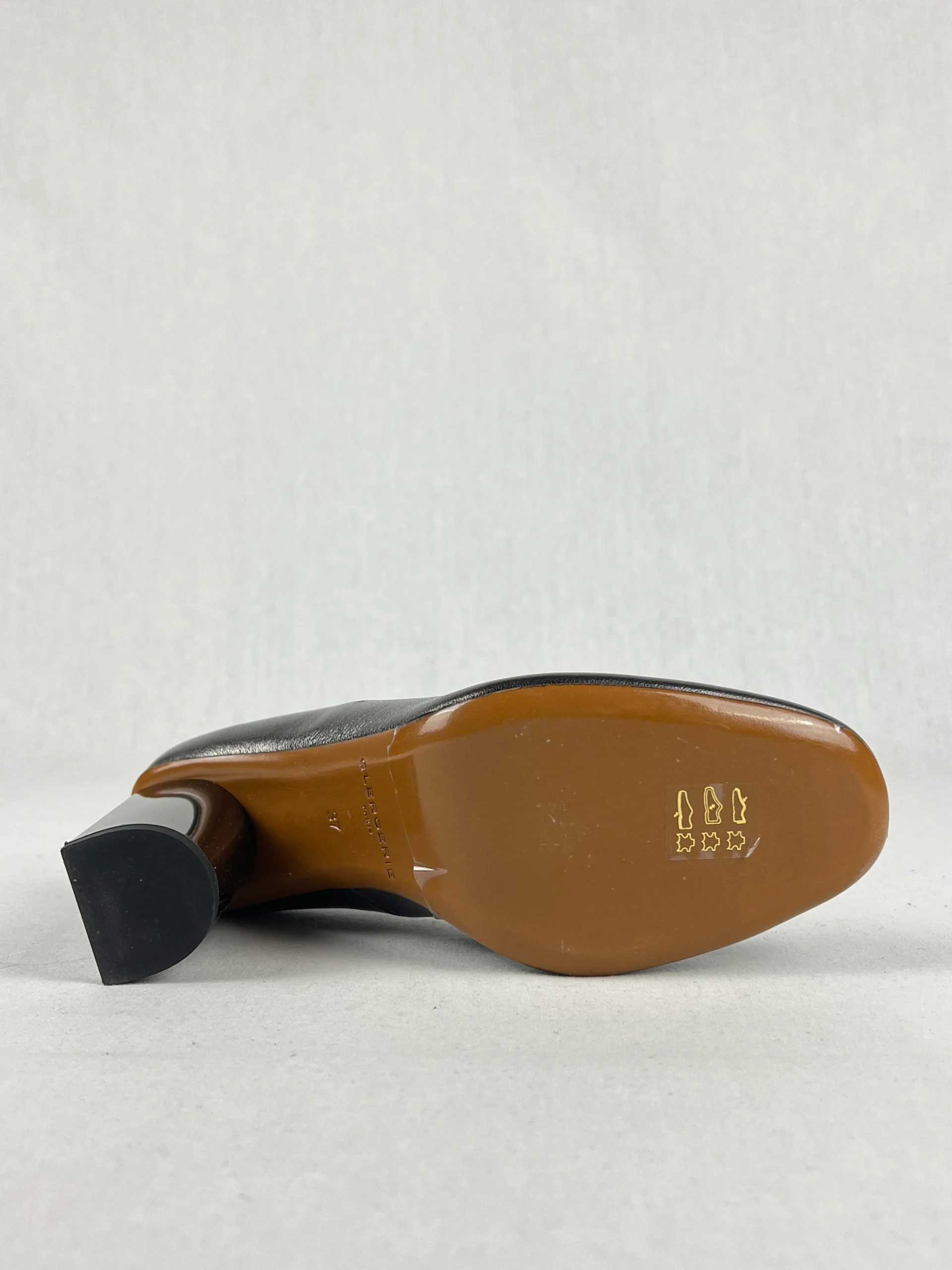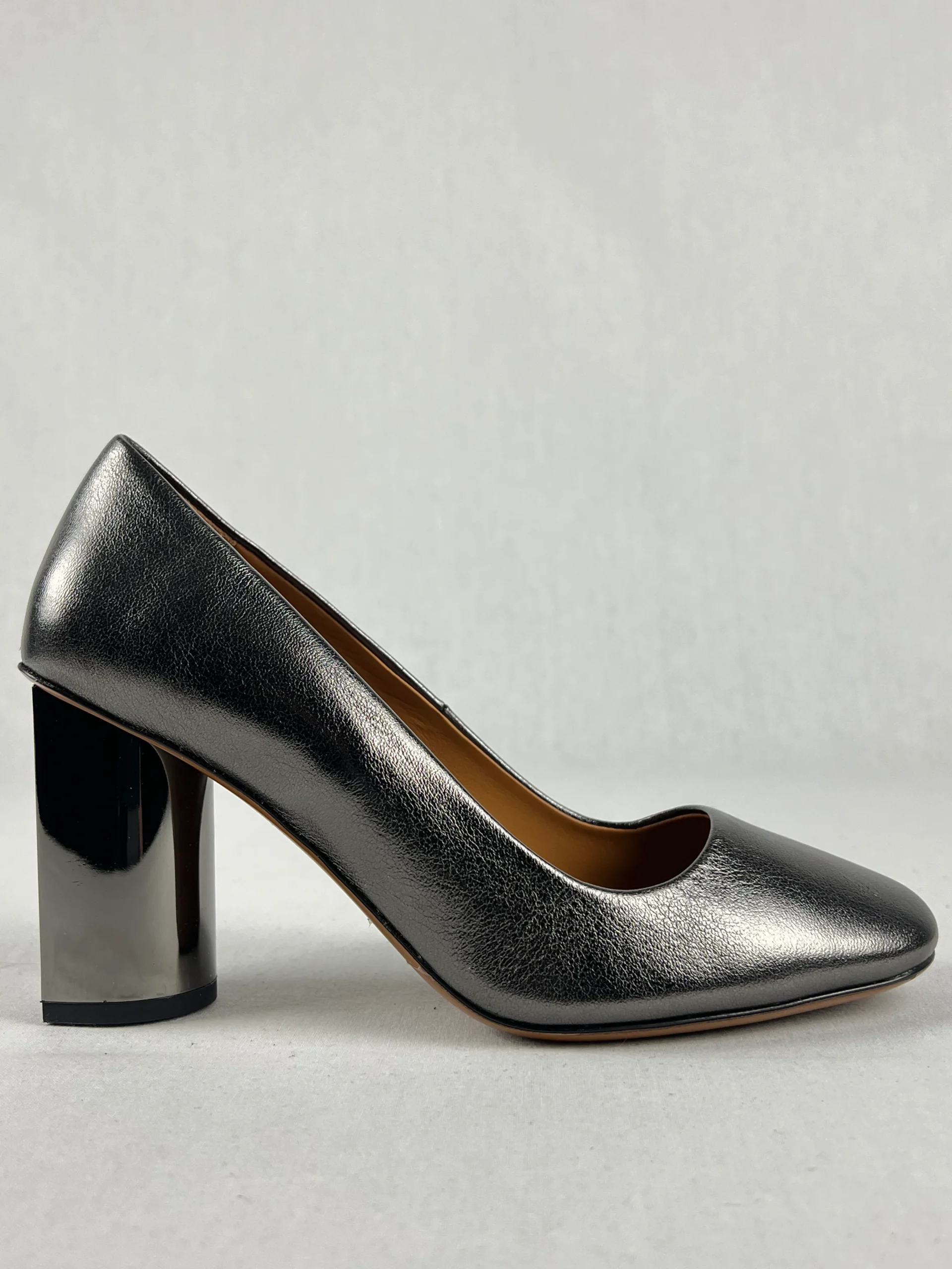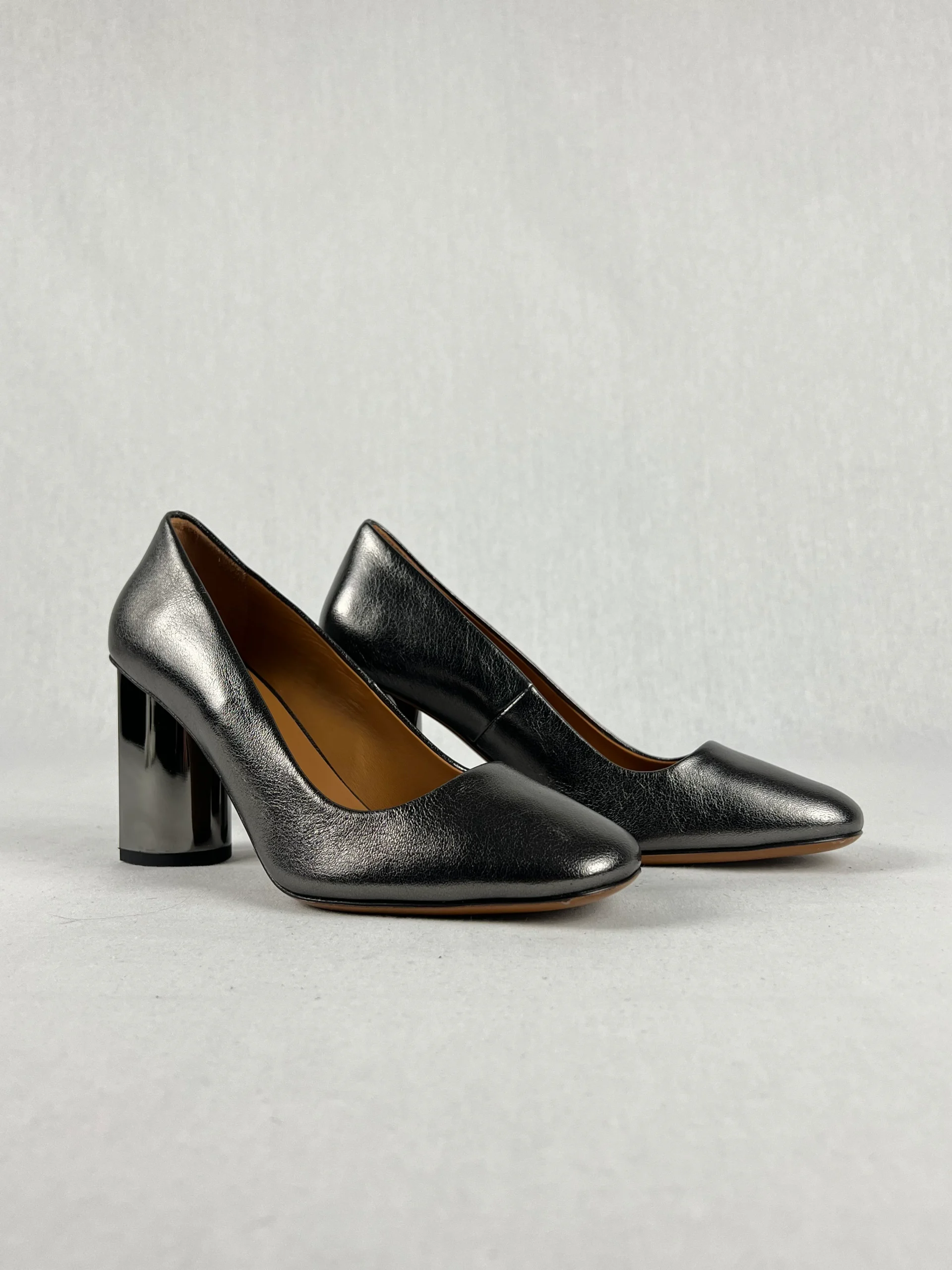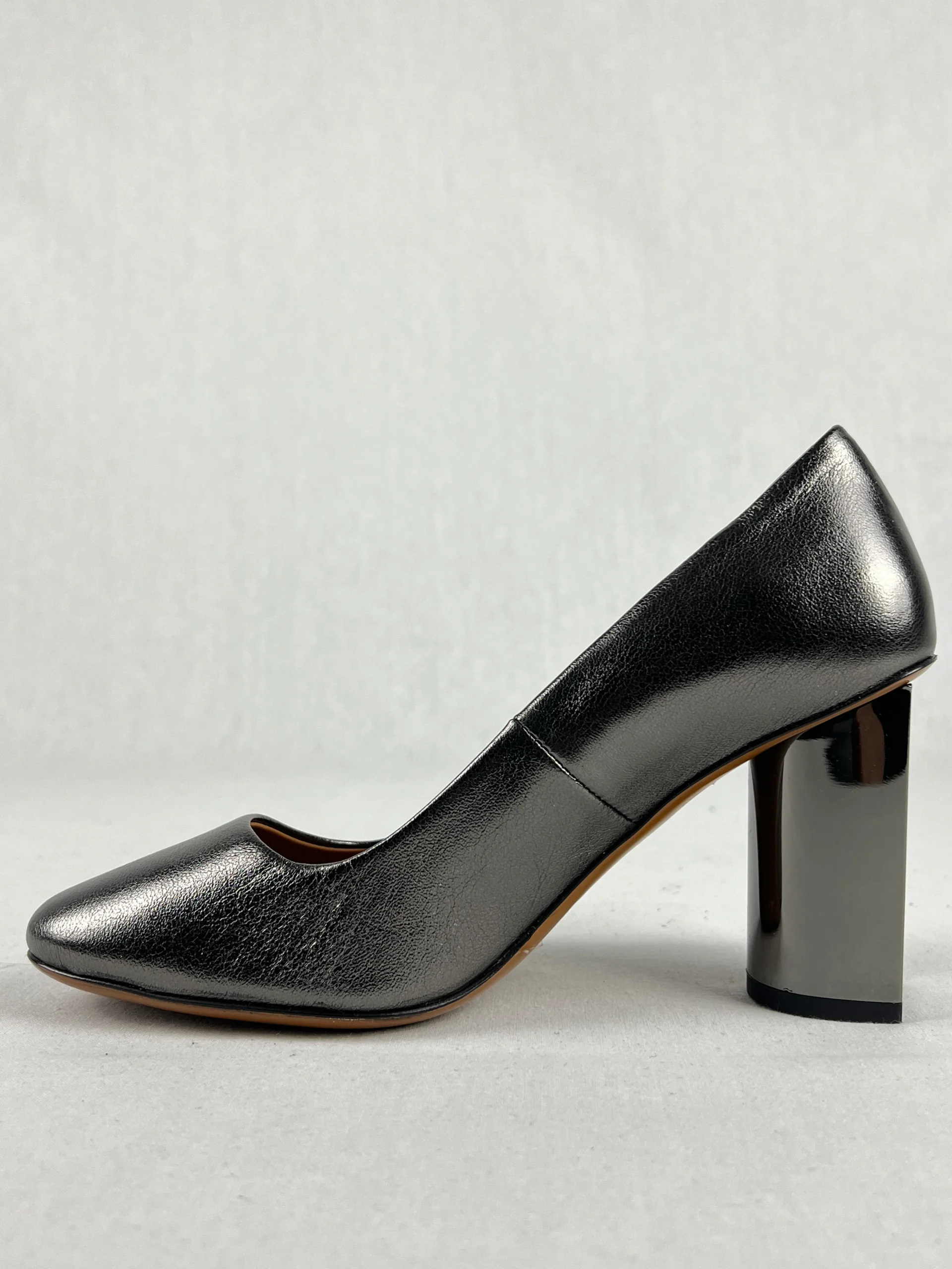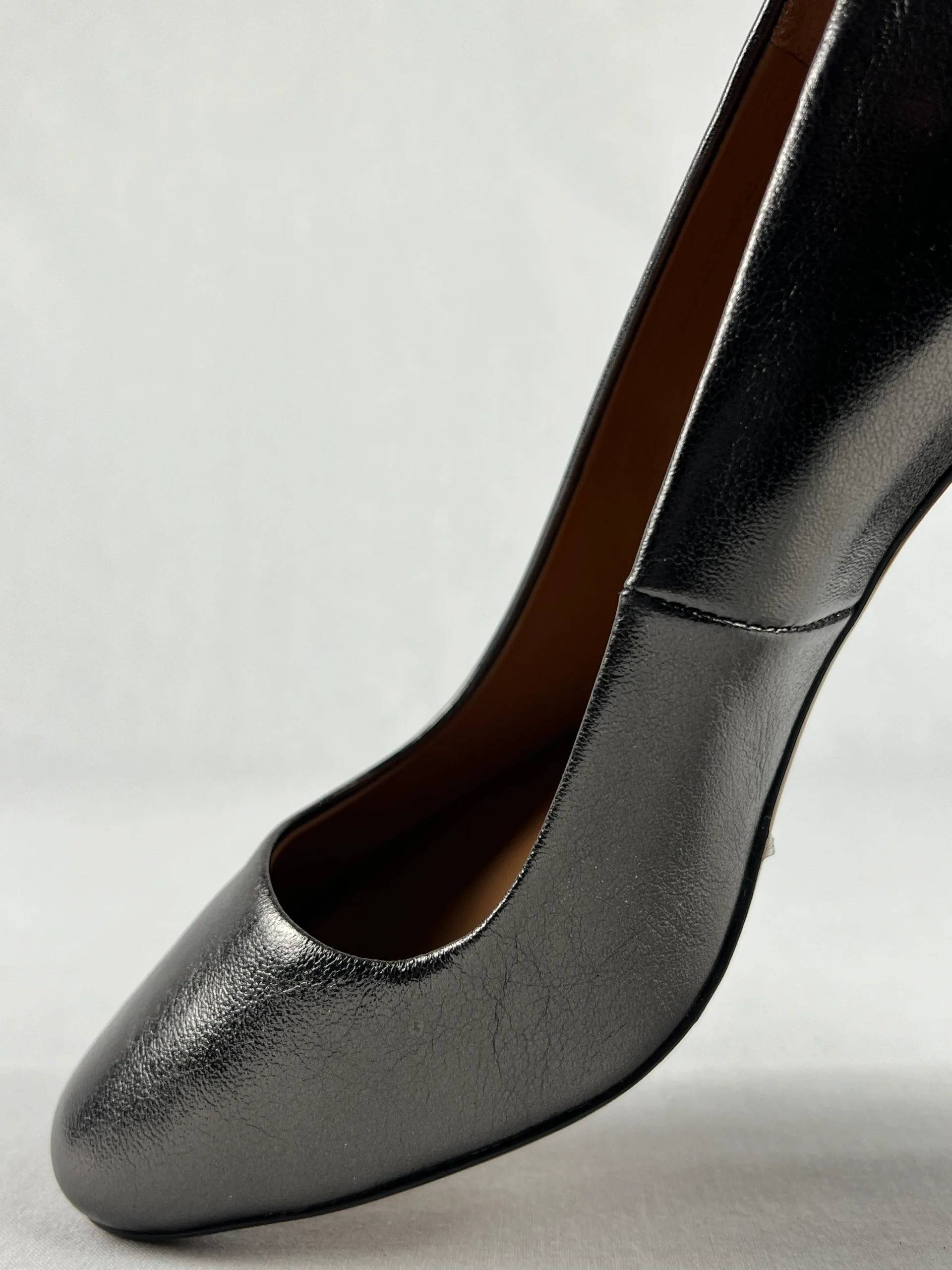 Chaussures de la marque Clergerie modèle Juline Talon en cuir argenté, de type slip-on, avec un talon de 88 mm de hauteur. Une housse de protection est fournie avec ces chaussures. Matières : 100% Cuir