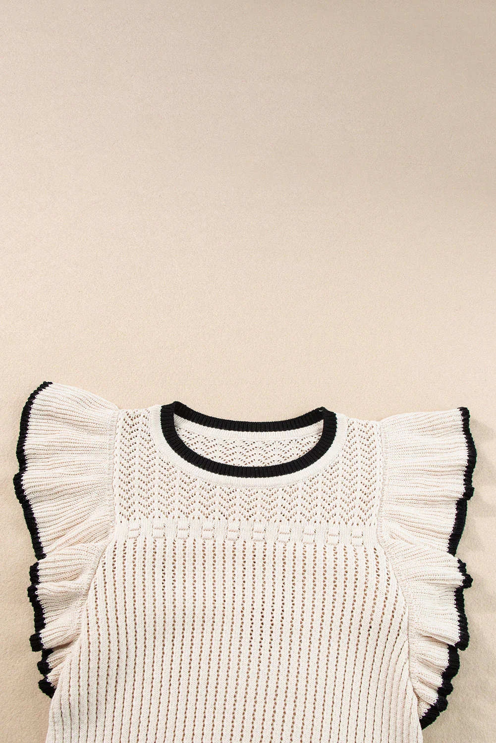 Ce débardeur présente une bordure à volants en crochet, un tissu tricoté de haute qualité et un design polyvalent, parfait pour les femmes modernes et élégantes.