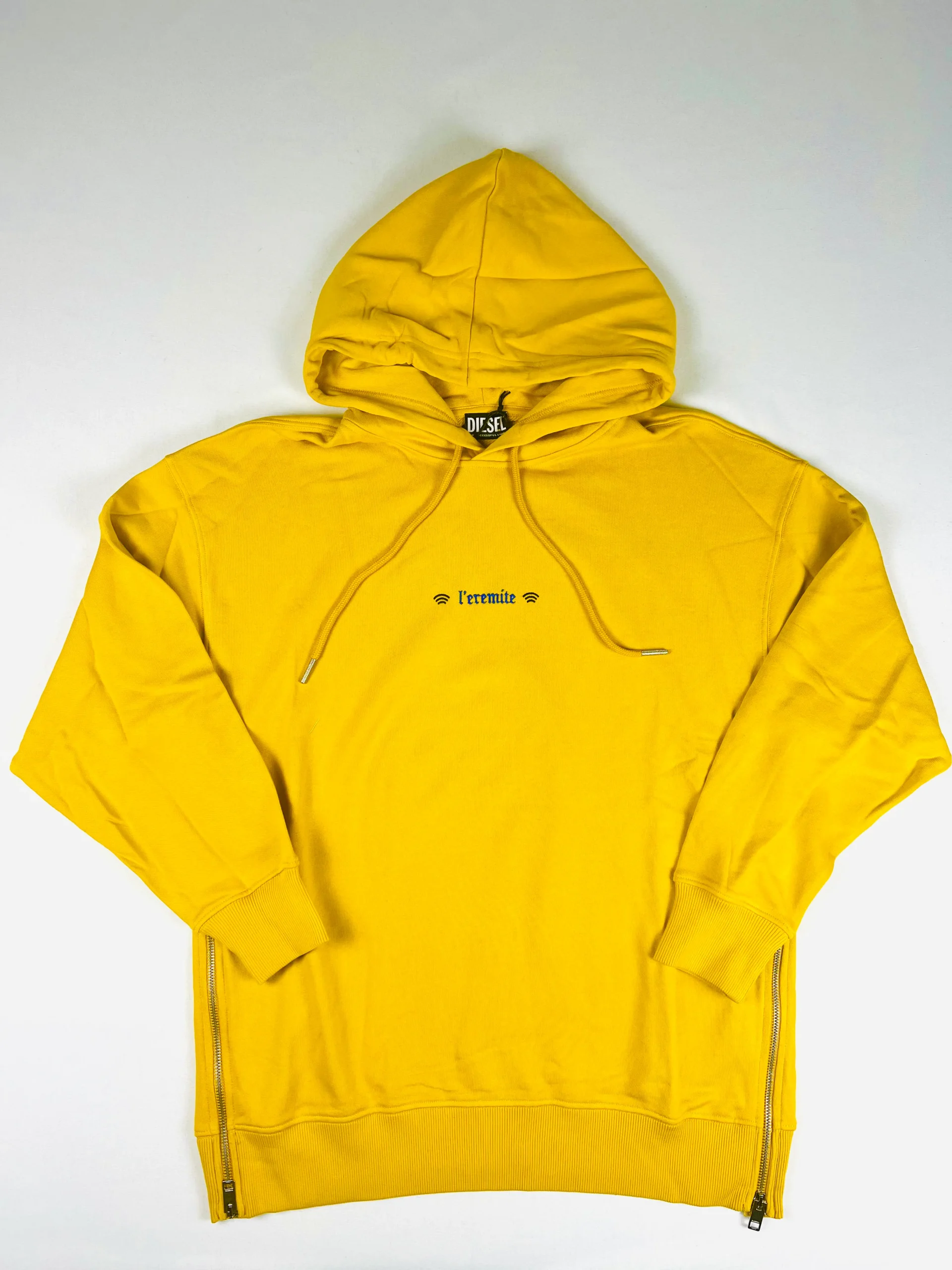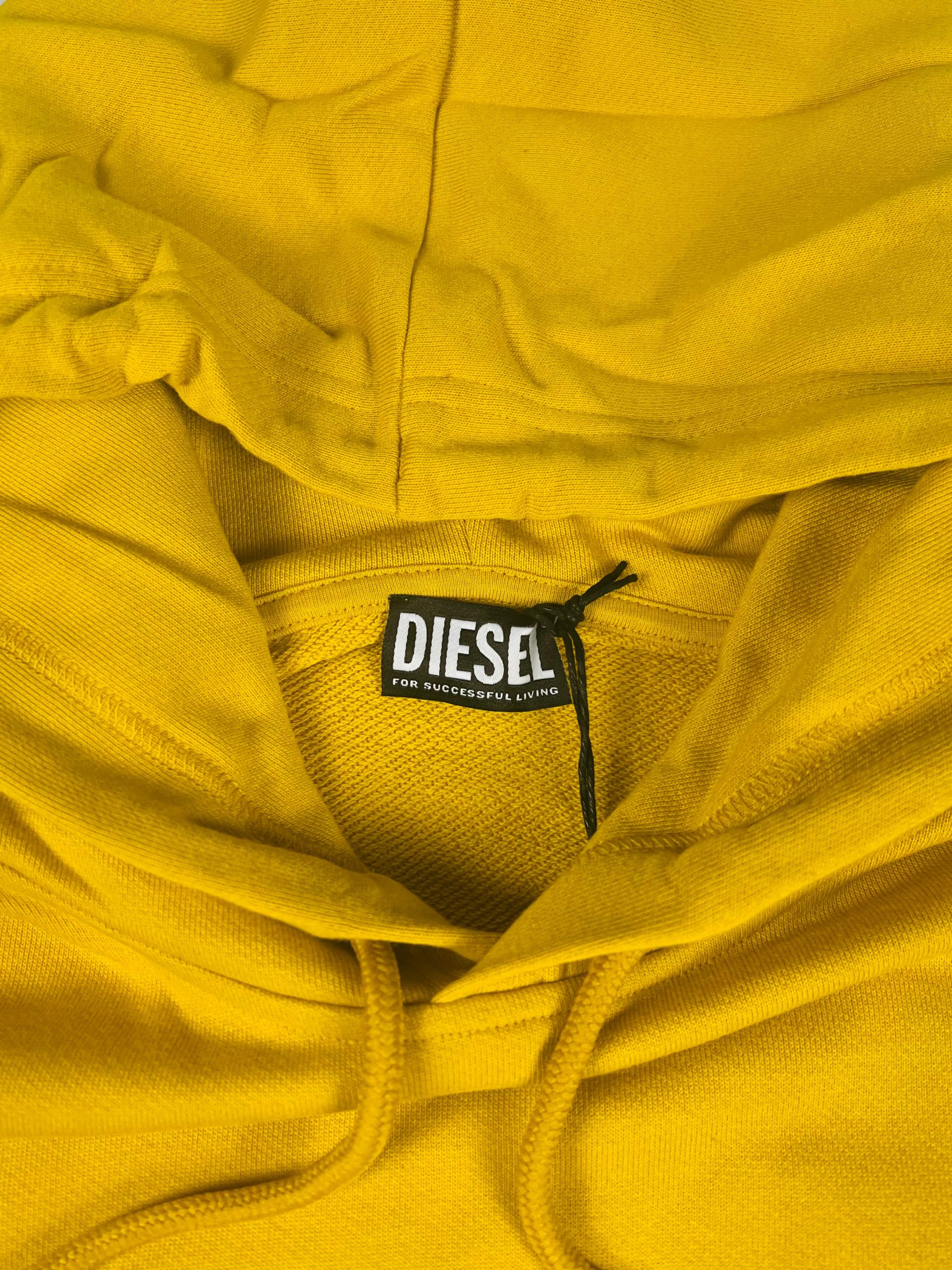 Sweat-shirt à capuche de la marque Diesel modèle F-Gully Hood B1 Felp. Sweat à capuche jaune détaillé avec des broderies sur la capuche et l’avant. Il se distingue par une impression originale à l’arrière et des zips sur les côtés, permettant de varier le style selon les envies. Matière : 100% Coton