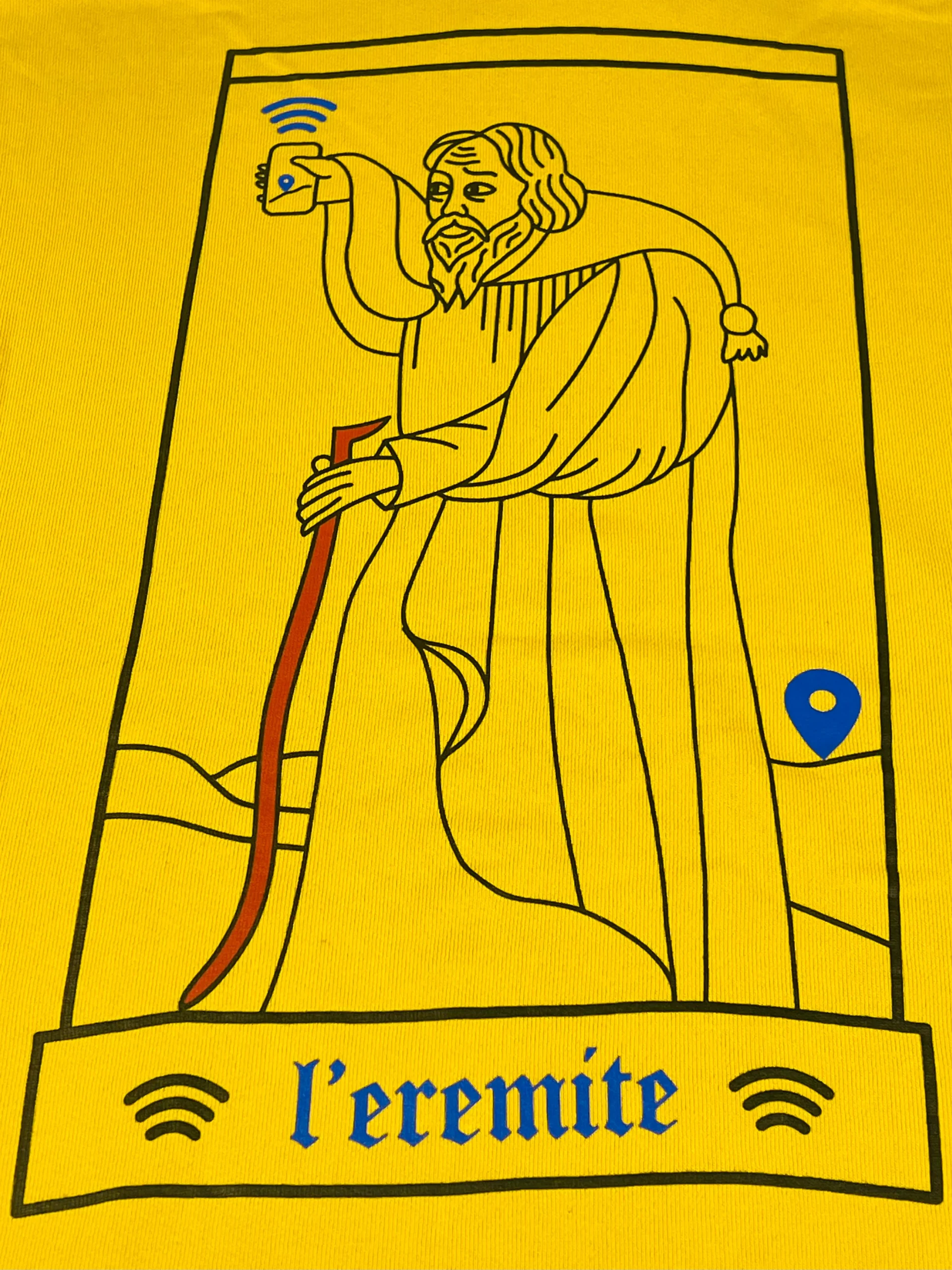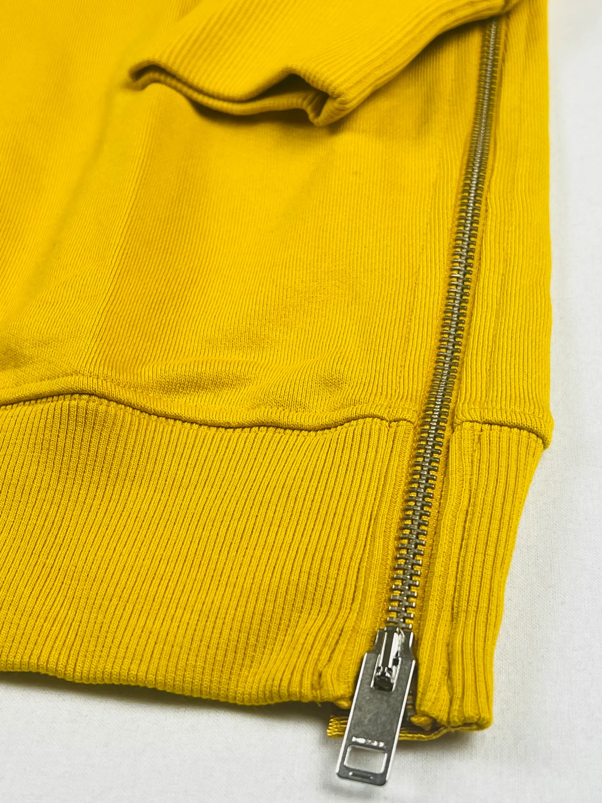 Sweat à capuche jaune détaillé avec des broderies sur la capuche et l’avant. Il se distingue par une impression originale à l’arrière et des zips sur les côtés, permettant de varier le style selon les envies.