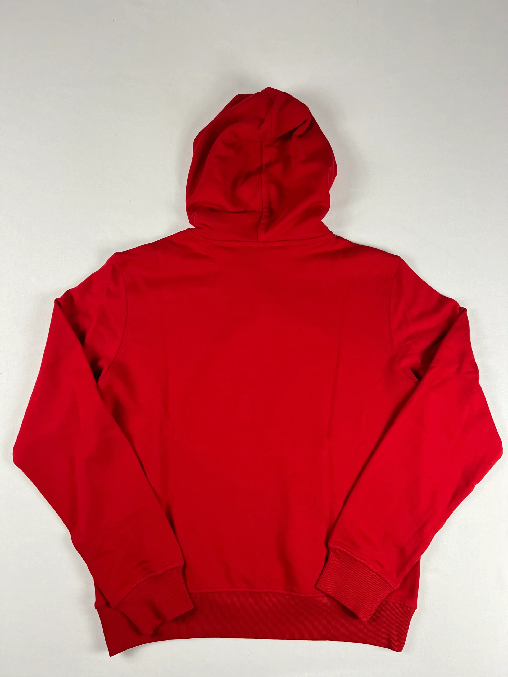 Sweat rouge à capuche épuré avec un logo imprimé sur l’avant.