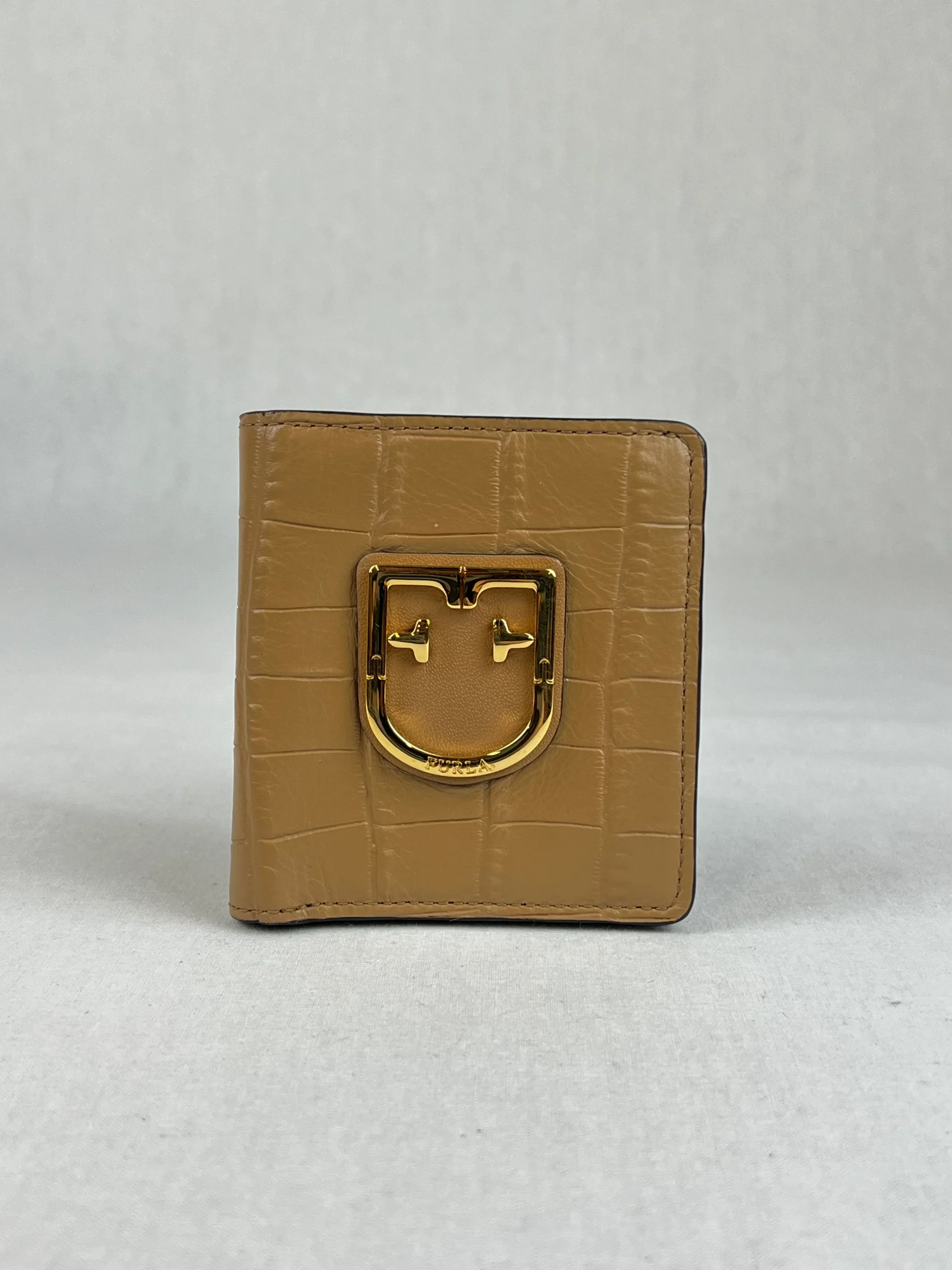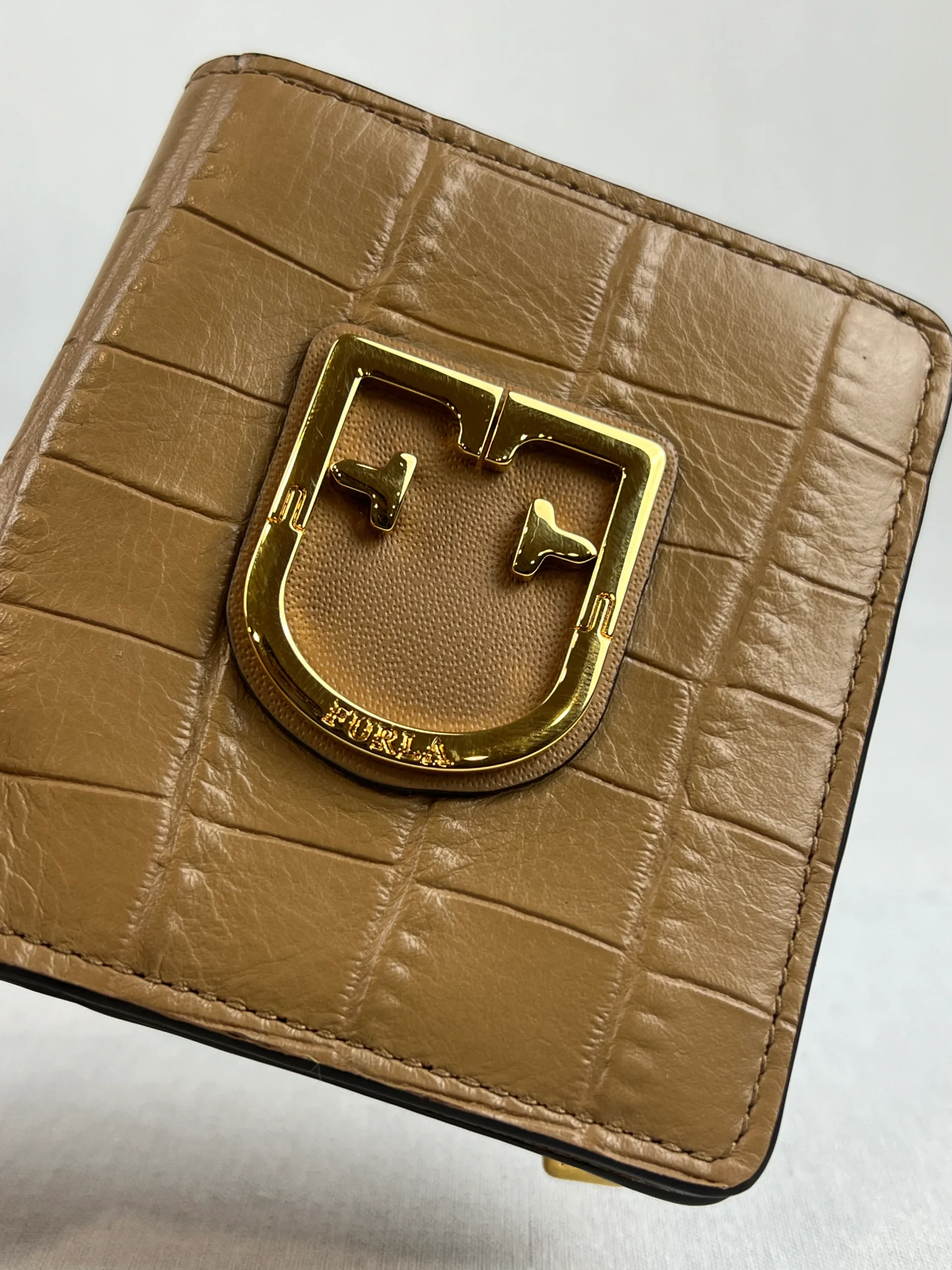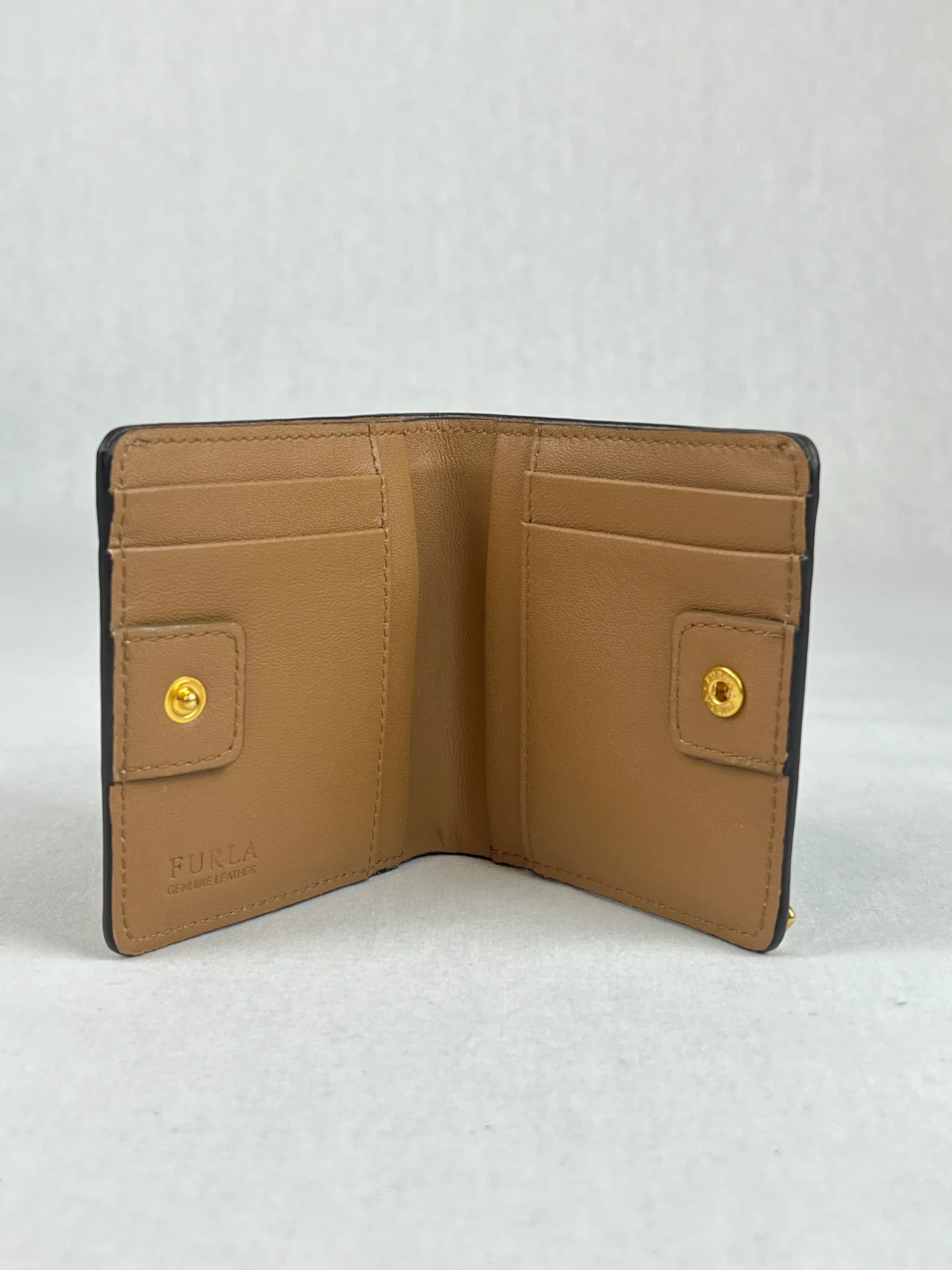 Portefeuille de la marque Furla modèle Belvedere Ce modèle compact est doté d’une fermeture à bouton et d’une poche zippée à l’arrière. L’intérieur comprend une poche pour les billets, six fentes pour cartes, ainsi que deux poches supplémentaires. Une pochette de protection est fournie avec ce portefeuille. Matières : 100% Cuir
