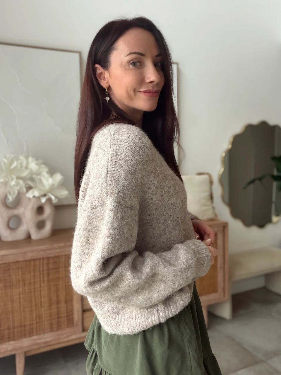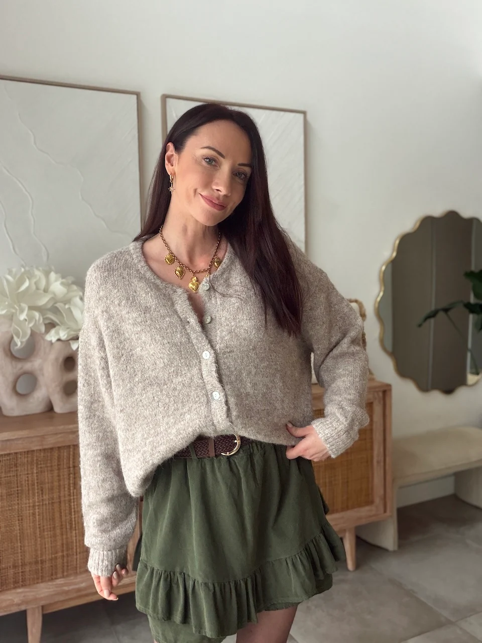 Un gilet doux et intemporel, facile à porter au quotidien. Sa coupe simple et ses boutons nacrés en font une pièce idéale à superposer sur une blouse ou un top.