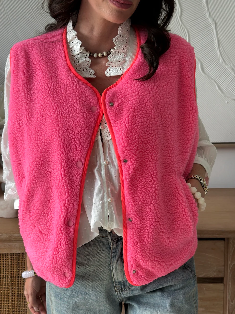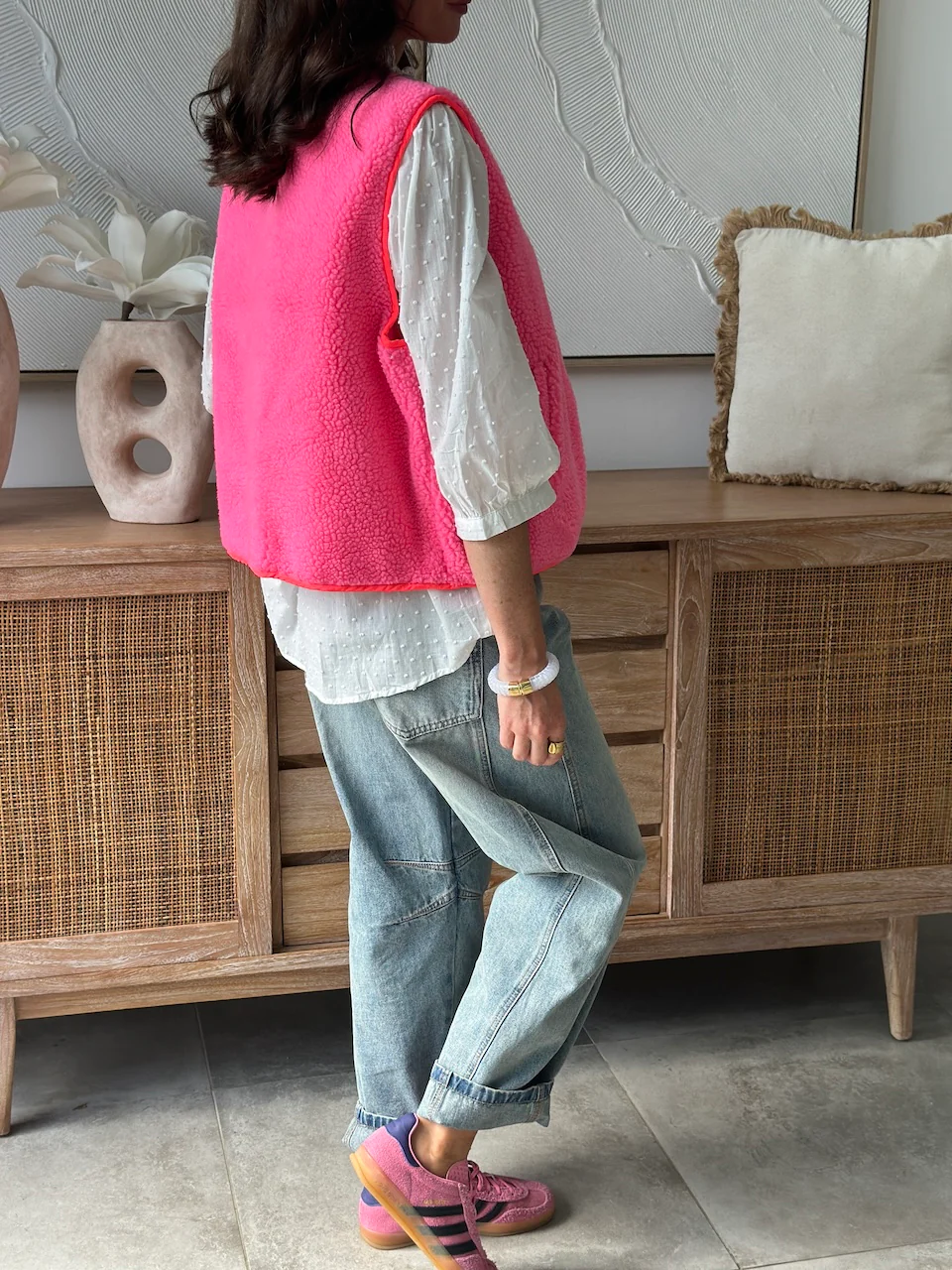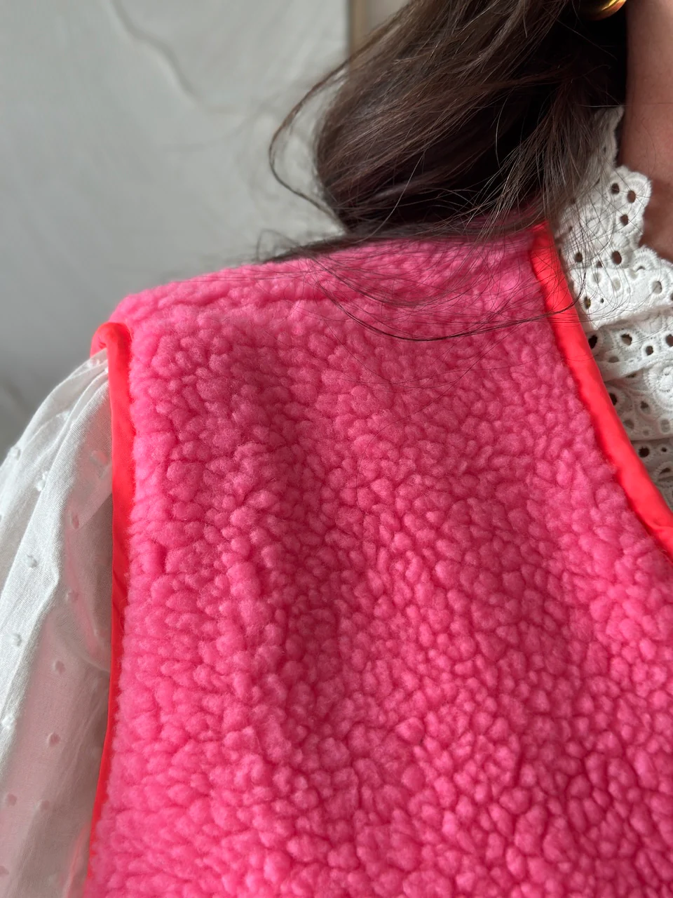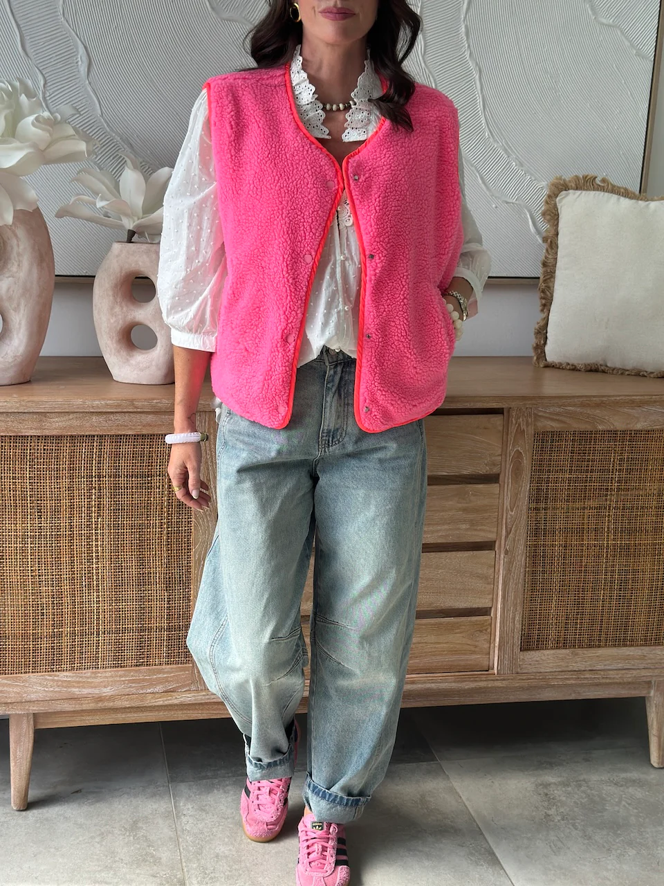 *** PRESENTATION VIDEO DU PRODUIT EN 3e VIGNETTE *** Gilet sans manches. 2 vraies poches. Effet bouclette. Boutons pression à l’avant. Coloris : Rose fluo Existe en différents coloris. Taille : Taille unique 36/44 Julie mesure 1,70m et porte une taille unique. Mesures : Taille Unique Epaule à épaule 42 cm Aisselle à aisselle 63 […]