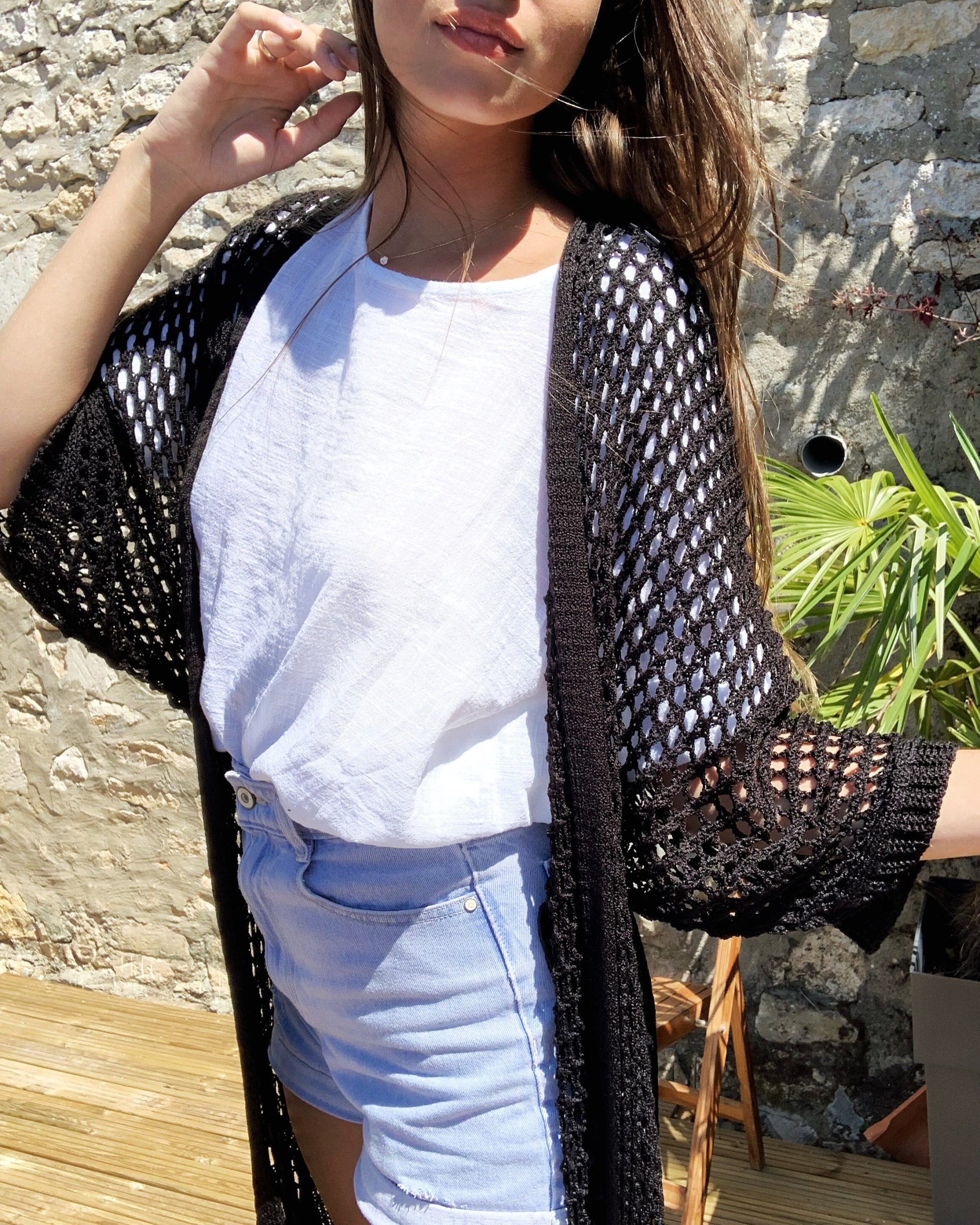 Gilet mi long à mailles effet filet. idéal pour la plage … Taille unique : Convient du 36 au 46.