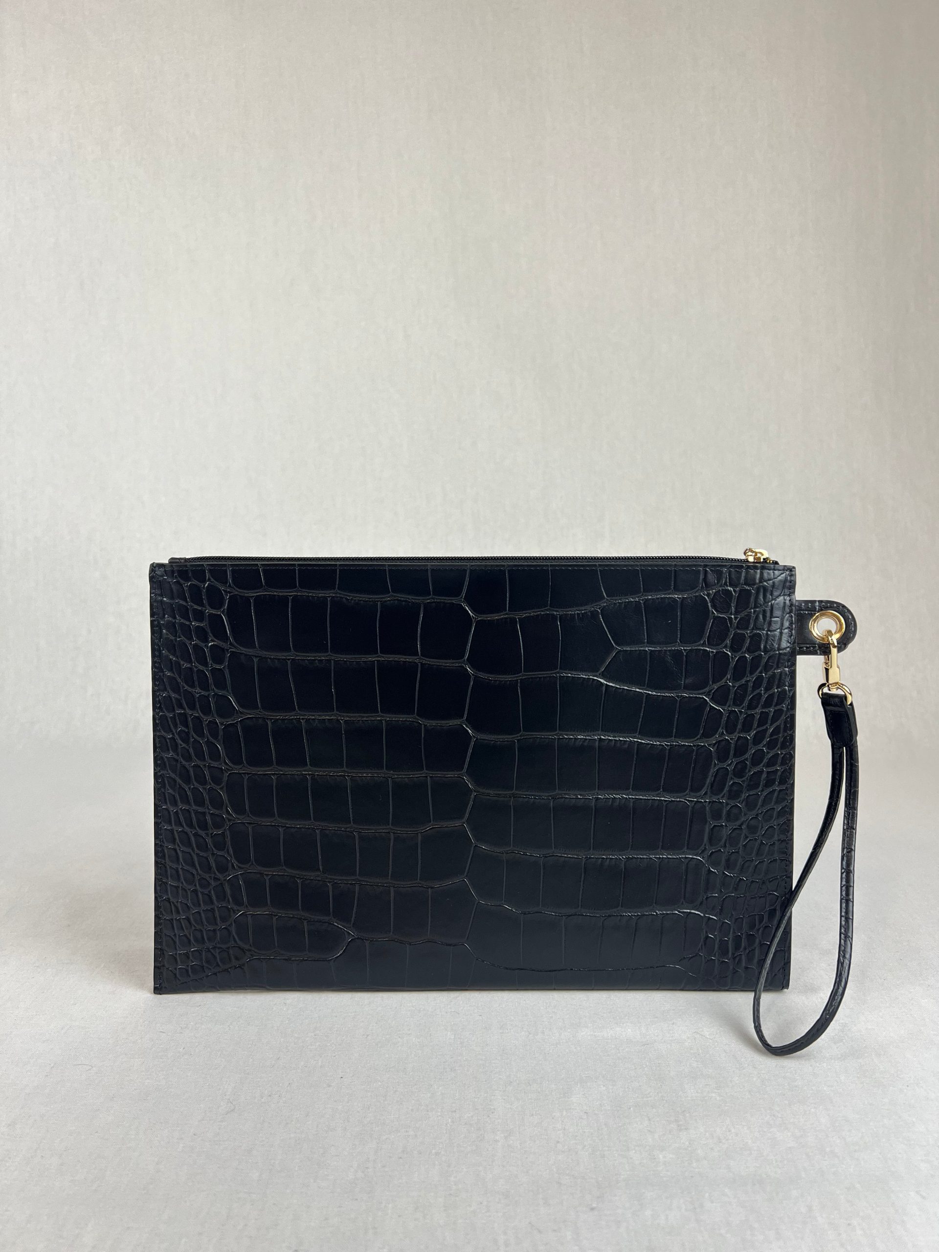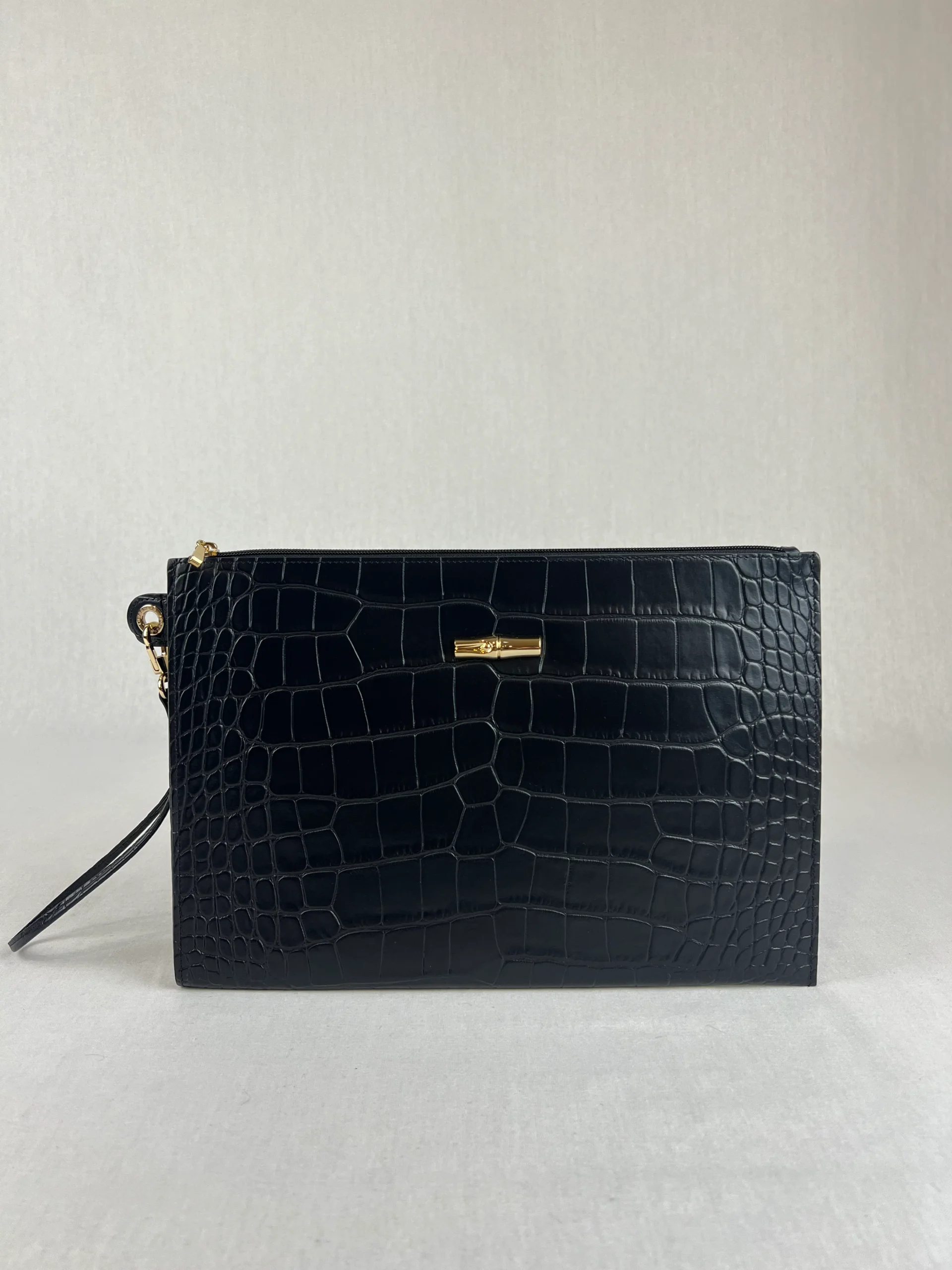 Pochette Noir Croco de la marque Longchamp Cette pochette est équipé d’une fermeture à bouton magnétique et comprend une poche intérieure zippée. Une pochette de protection est fournie avec ce sac. Matières : Cuir Taille : 26cm x 18cm x 2cm