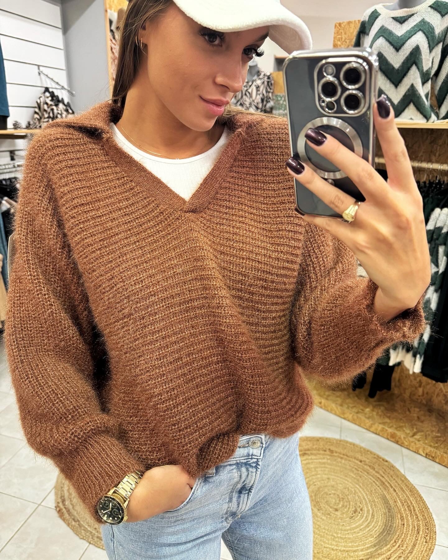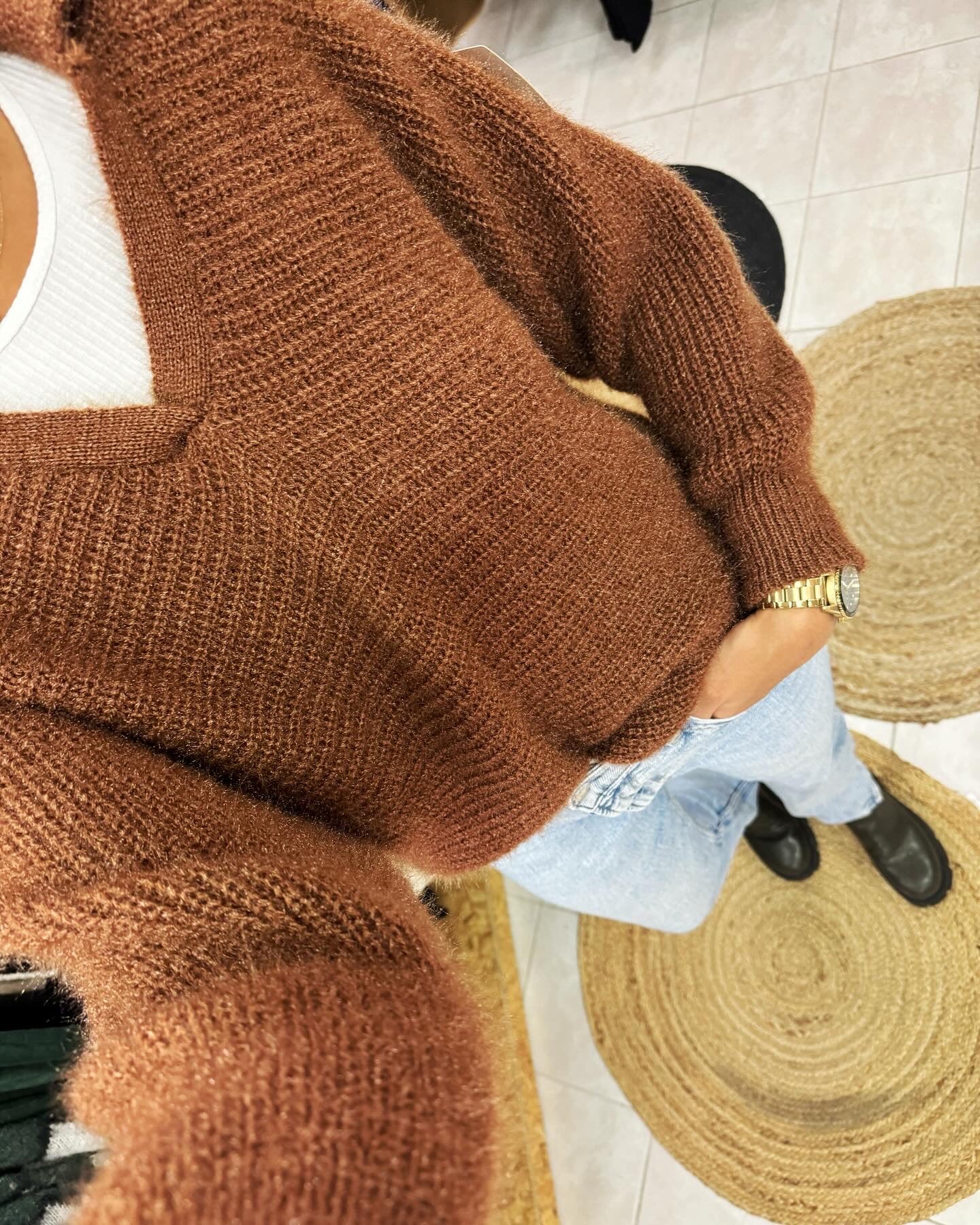 Pull épais maillés brillantes col V camel / beige TU / Convient du 36 au 42