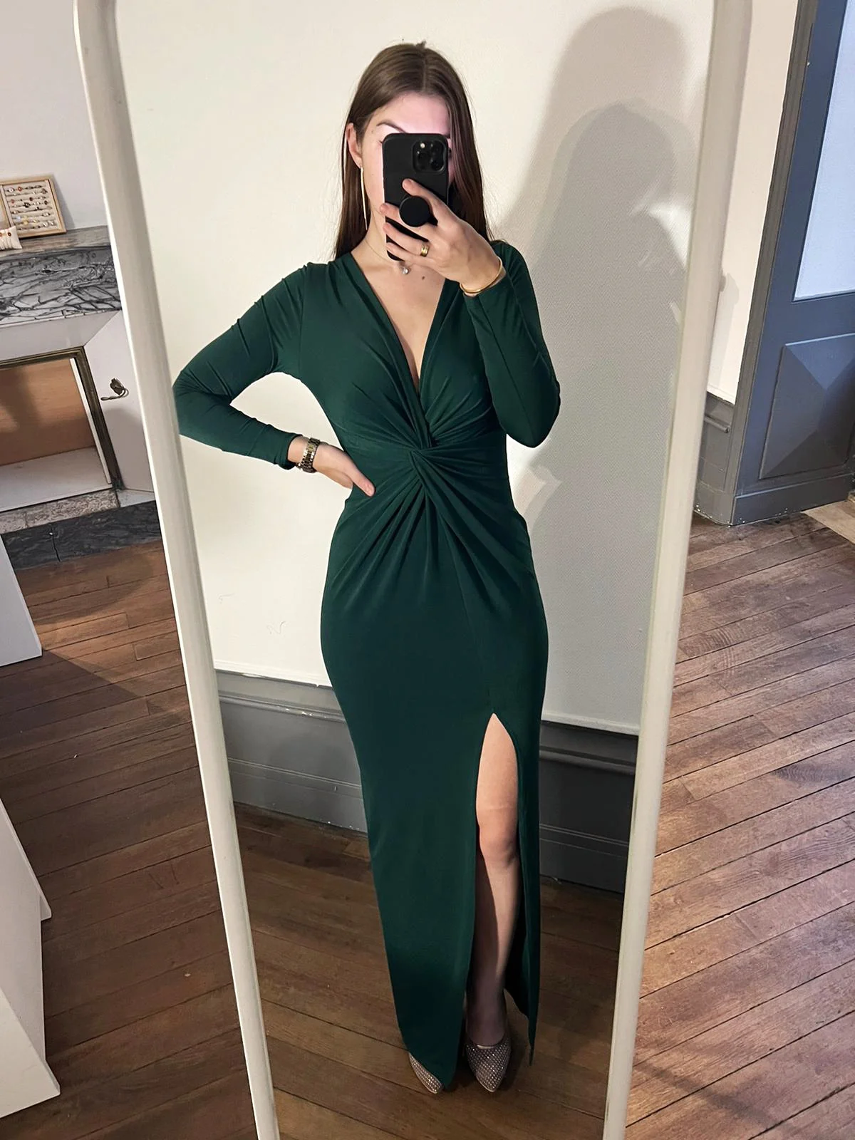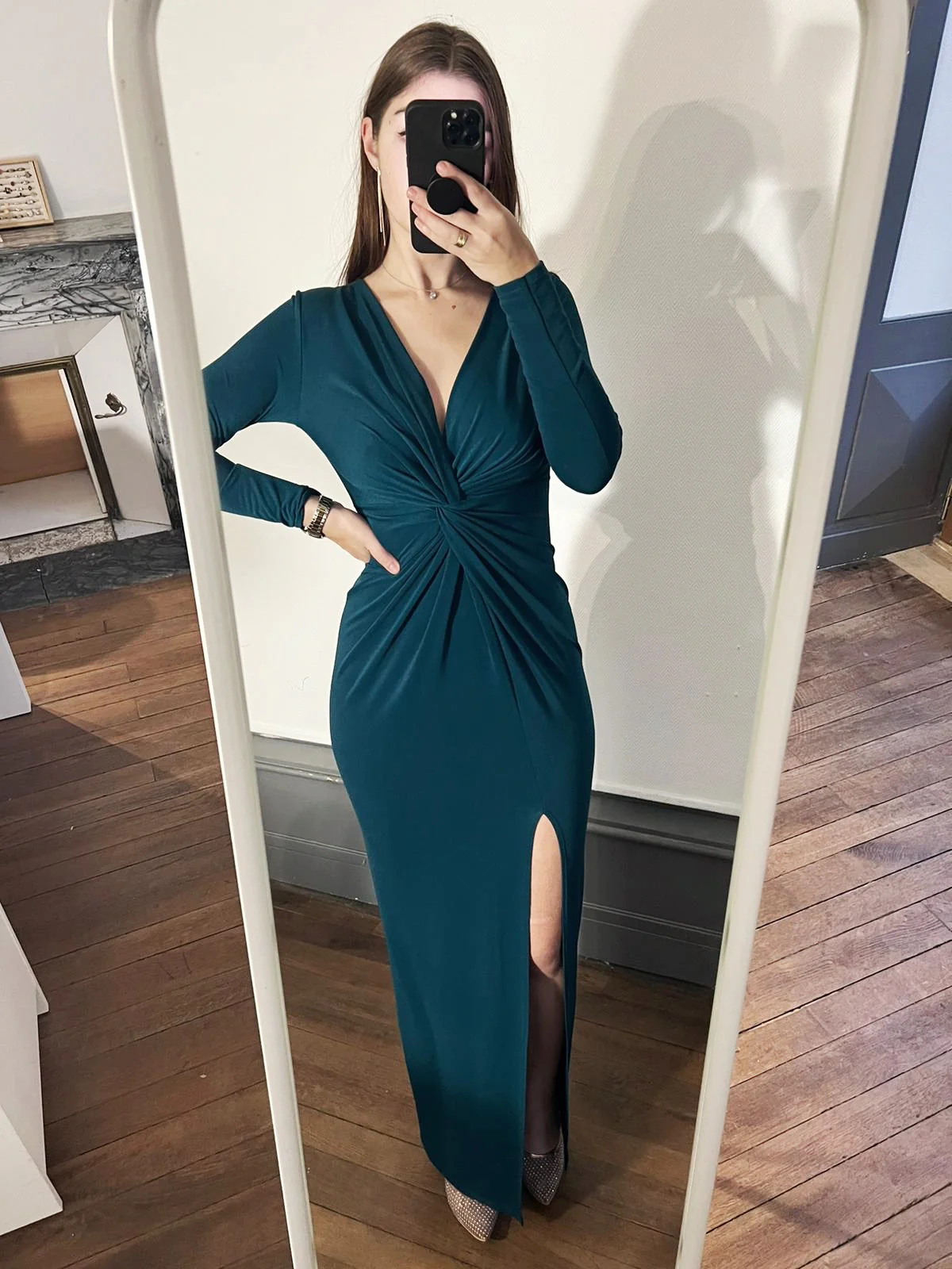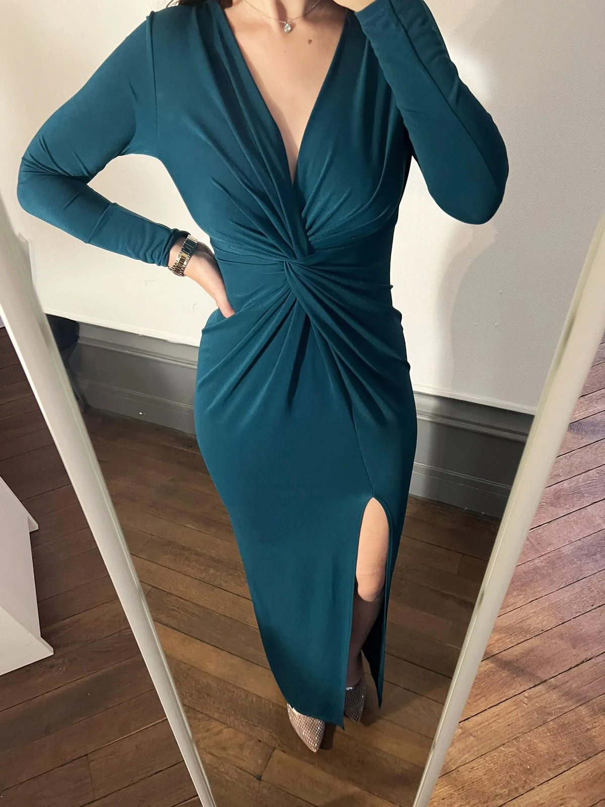 Robe longue fendue , coeur noué.