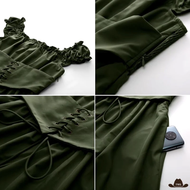 La robe longue de style western est considérée comme un grand classique de l’époque du Far West. Ses motifs caractéristiques et élégants, ainsi que sa coupe singulière ne passeront pas inaperçus auprès des passionnées de western.