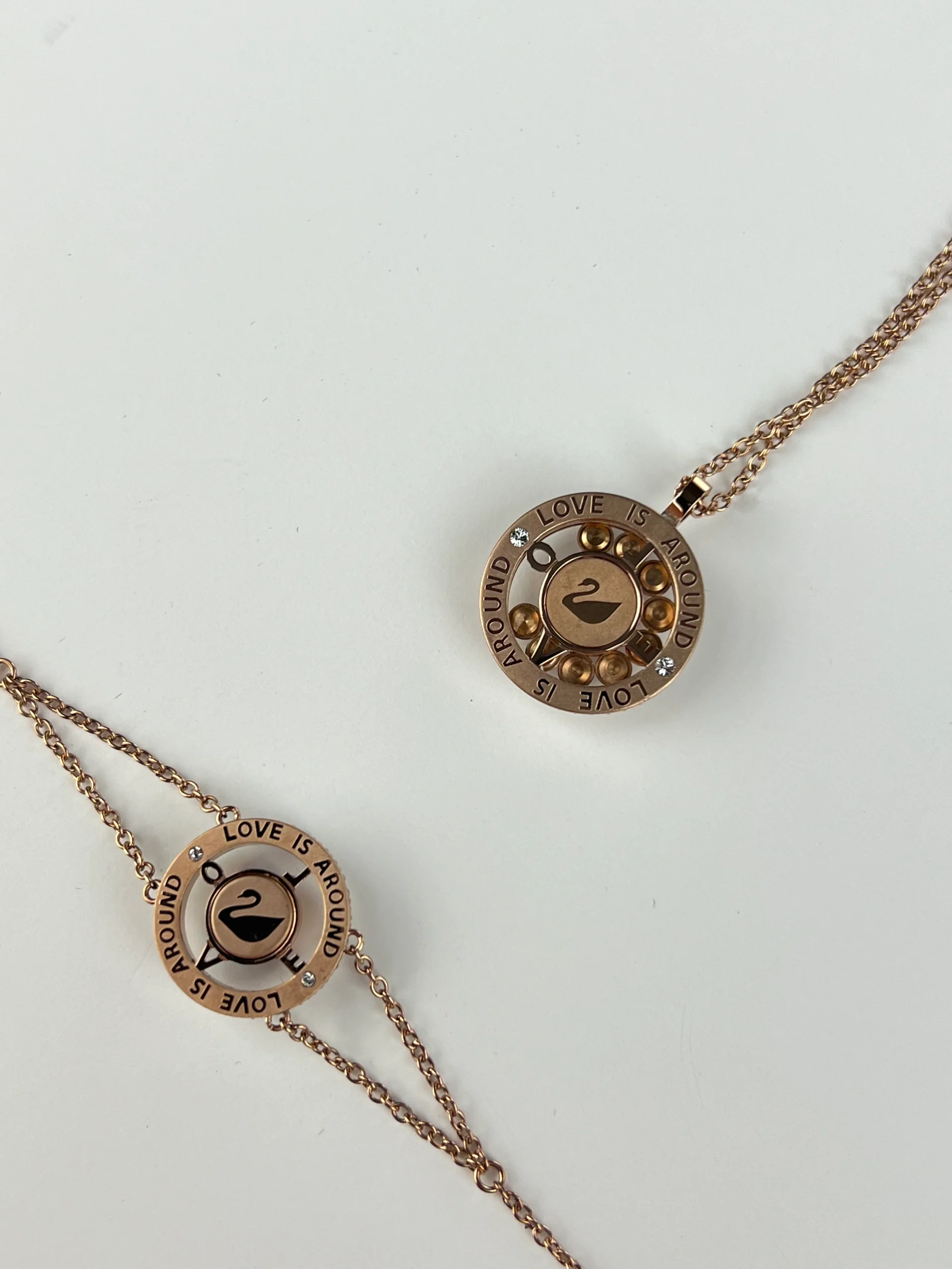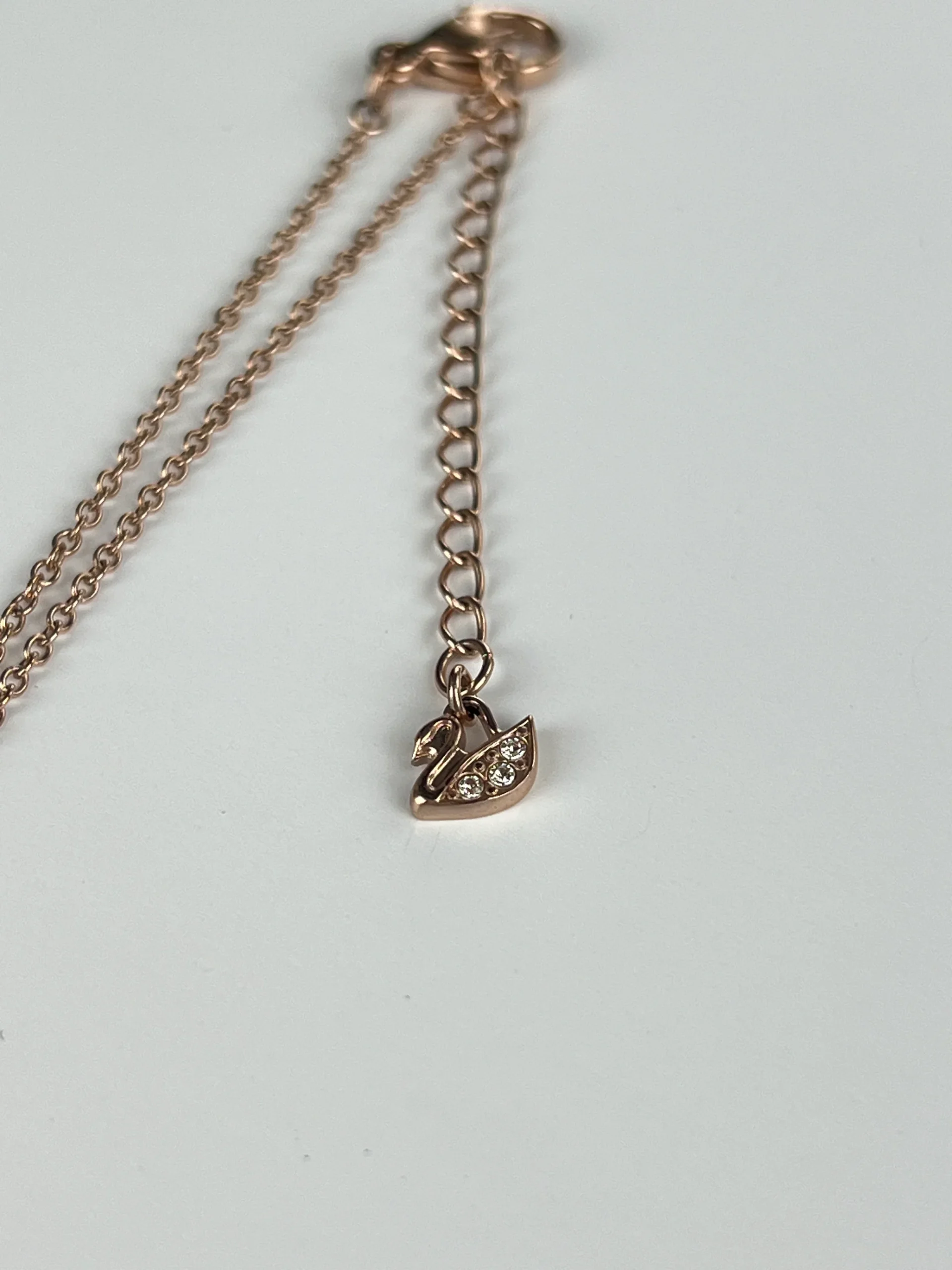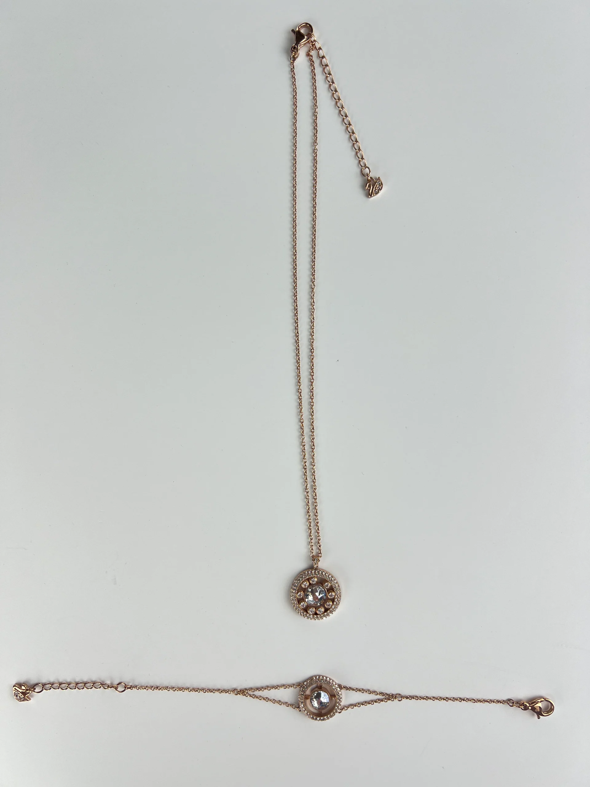 Bracelet & Collier de la marque Swarovski modèle Amiration. Ce collier et ce bracelet mettent en valeur une pierre centrale en cristal entourée d’un sertissage pavé, le tout dans une finition ton or rose. Matériaux: Cristaux Swarovski / Placage de ton Or Rose
