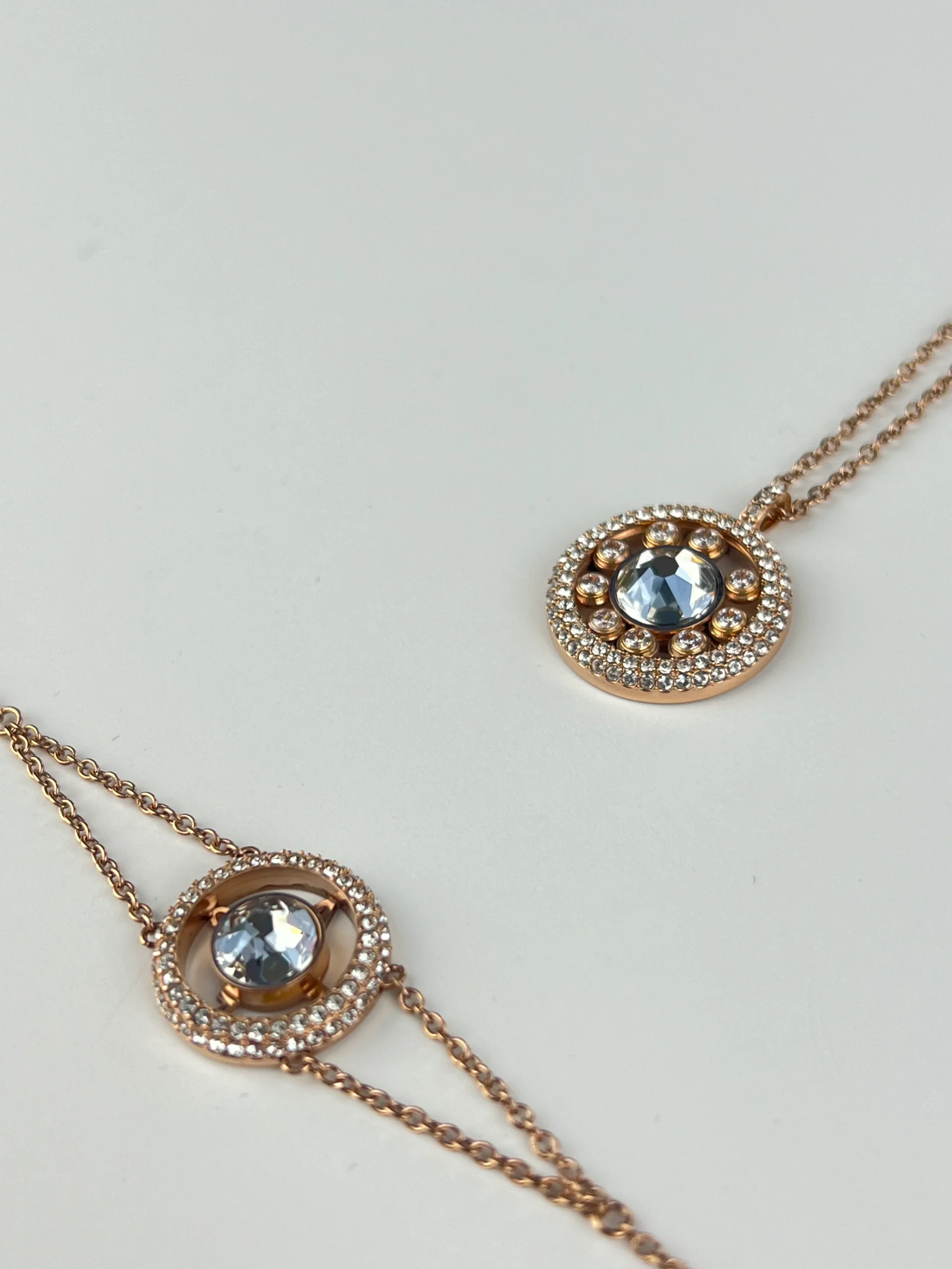 Ce collier et ce bracelet mettent en valeur une pierre centrale en cristal entourée d’un sertissage pavé, le tout dans une finition ton or rose.