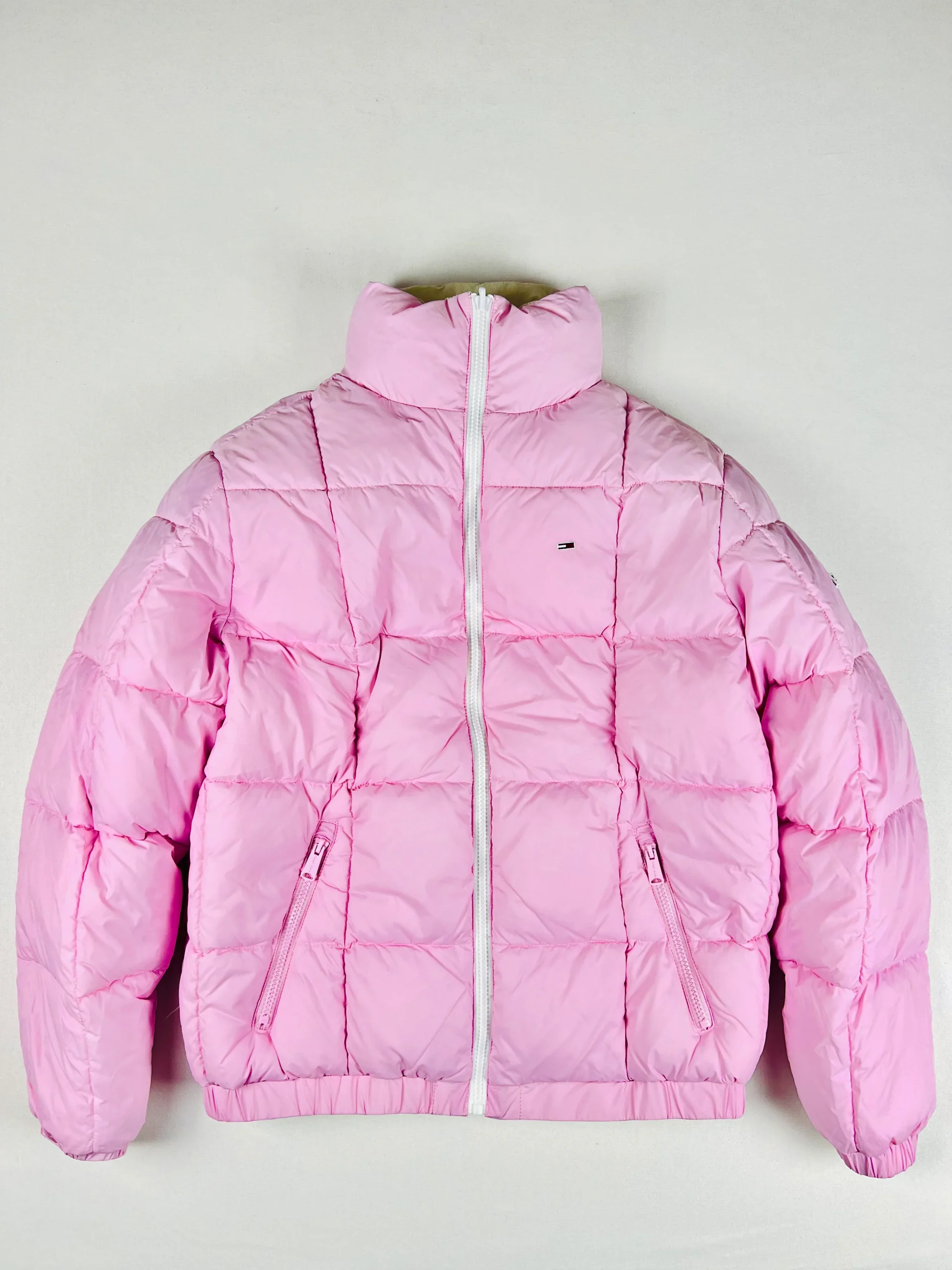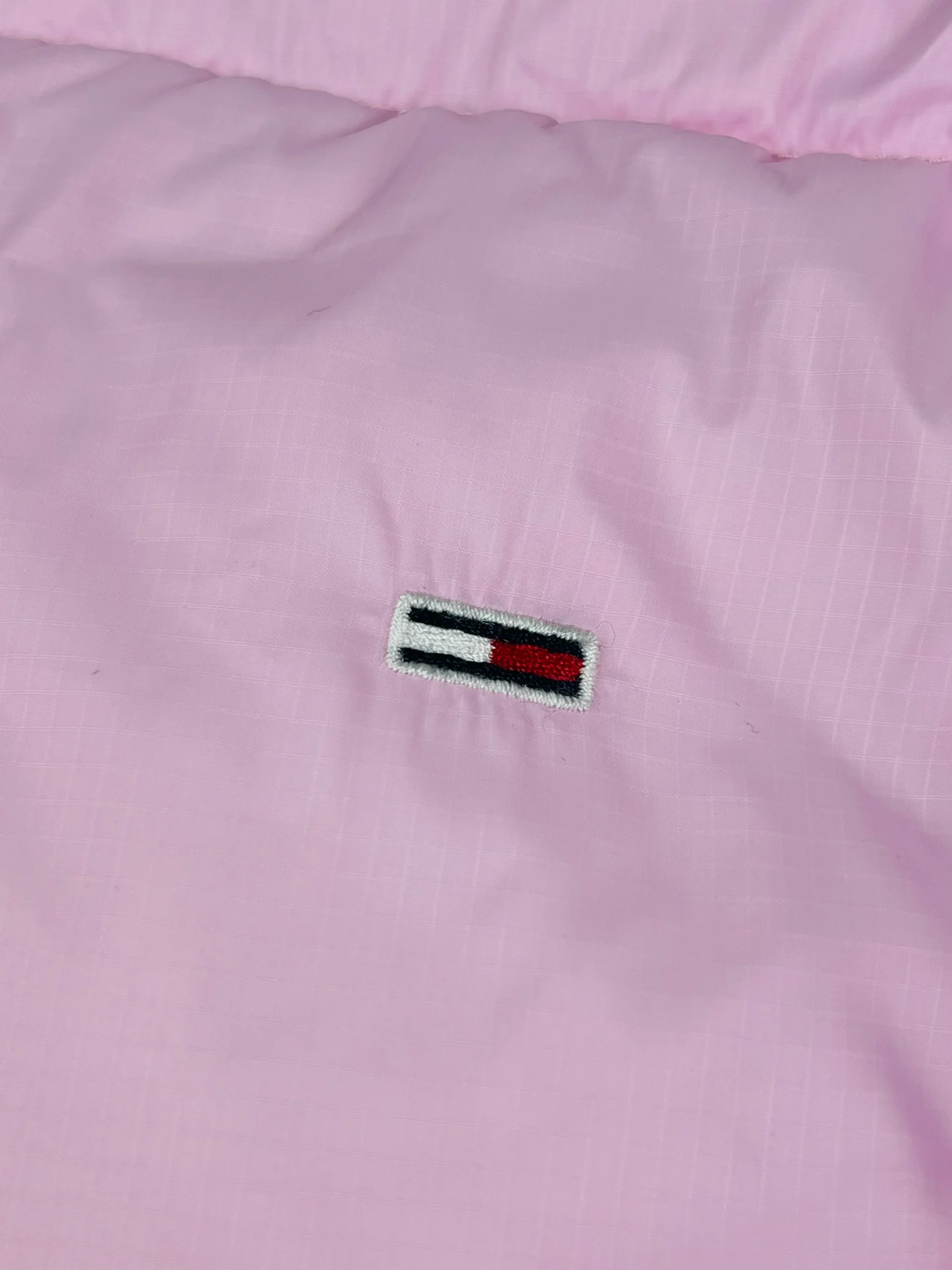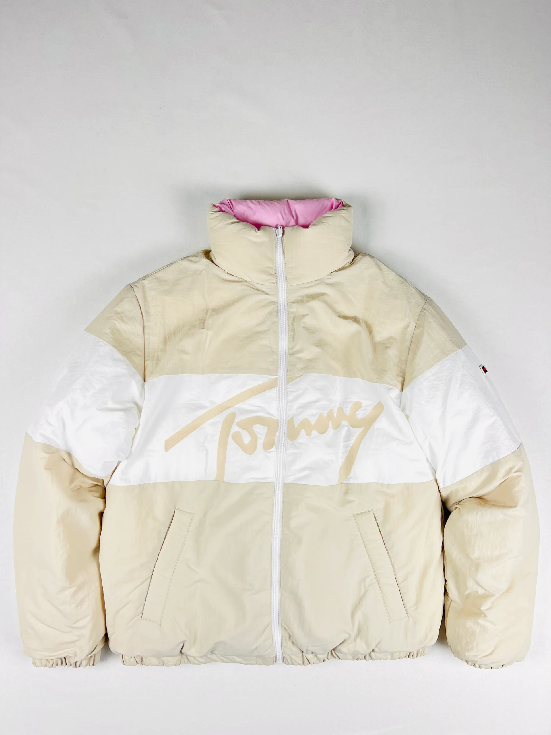 Manteau de la marque Tommy Hilfiger modèle French Orchid. Un manteau réversible, offrant un côté beige ou rose selon vos préférences, dans le modèle emblématique puffer de la marque. Matières : 100% Polyamide