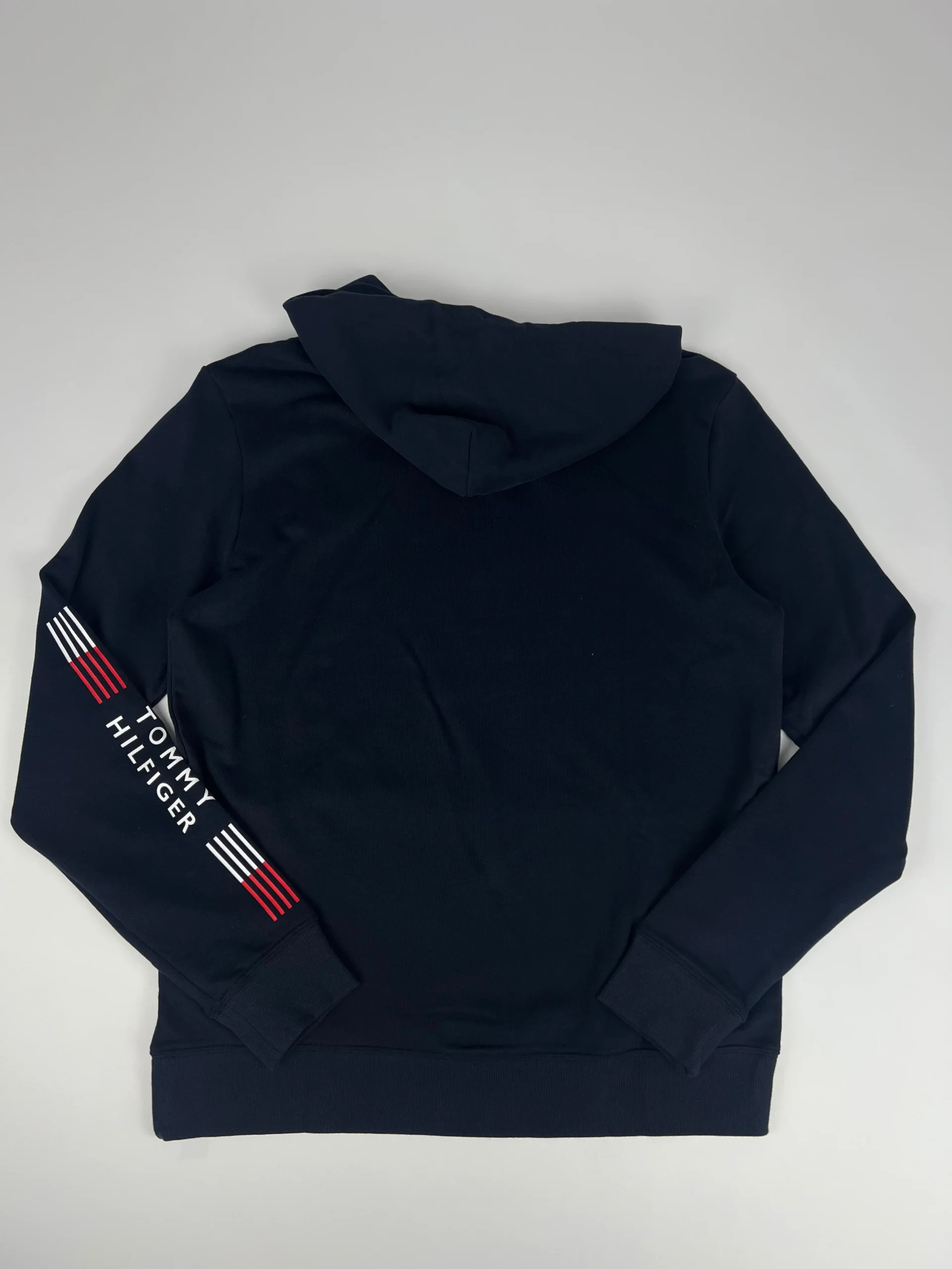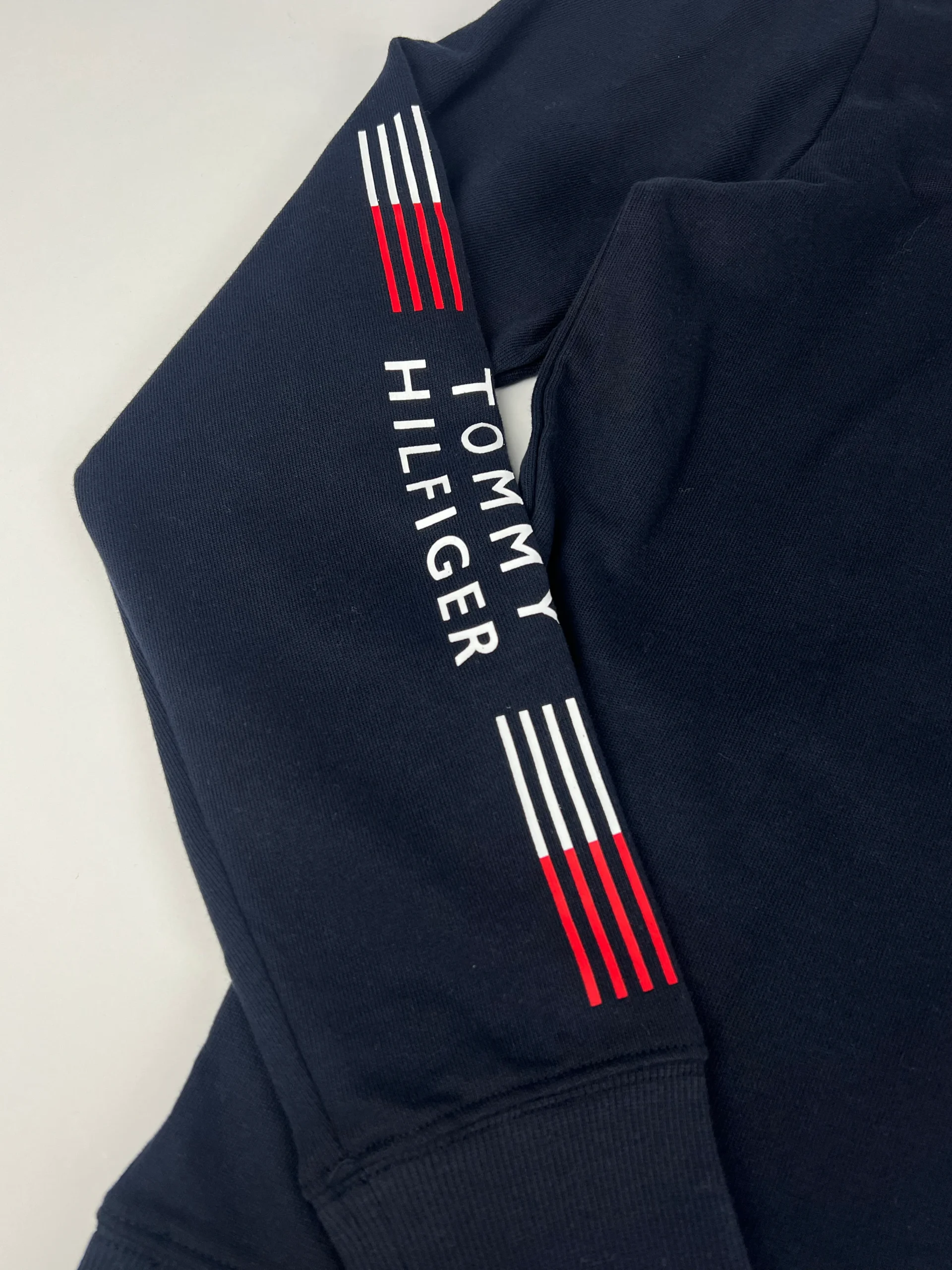 Sweat de la marque Tommy Hilfiger. Sweat avec logo blanc et rouge qui recouvre la manche gauche. Matières : 84 % Coton / 16 % Polyester