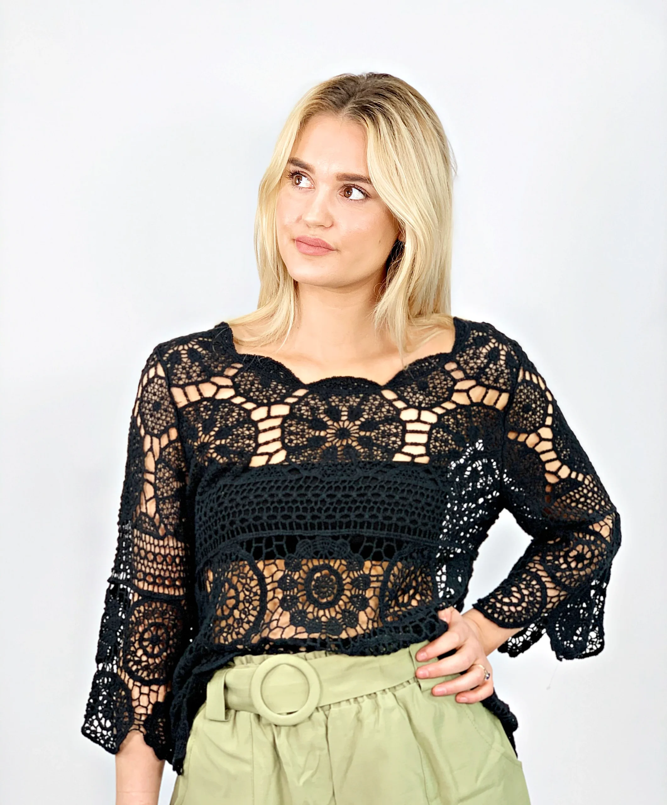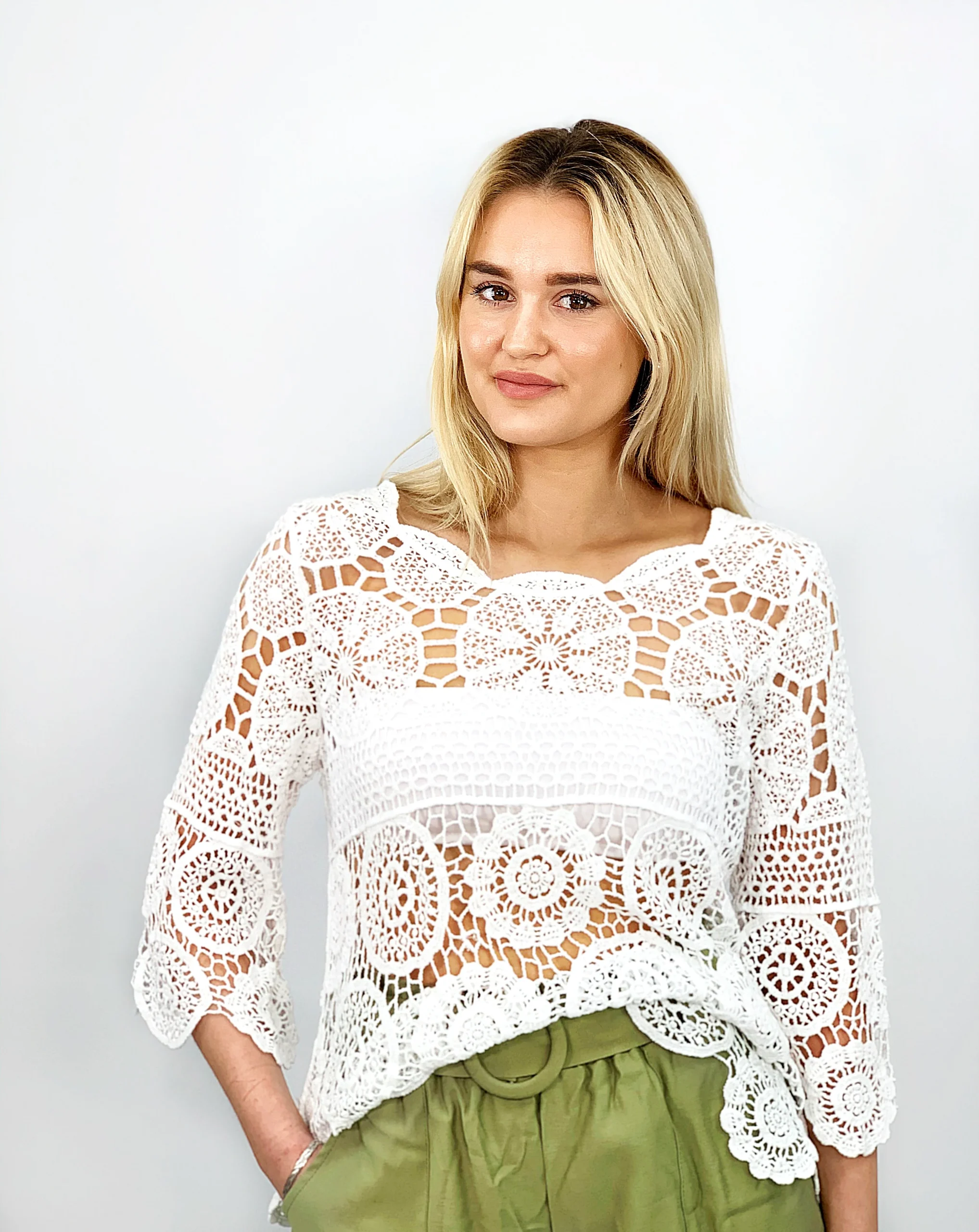 Top bohème ajouré à manches. Conseil taille : Ce top est proposé en taille unique. Il convient du 34 au 40. Adoptez ce look en mode « plage » comme « ville » selon les pièces que vous marierez avec. Made in China Composition : 100% Coton Conseil entretien : Laver à la main.