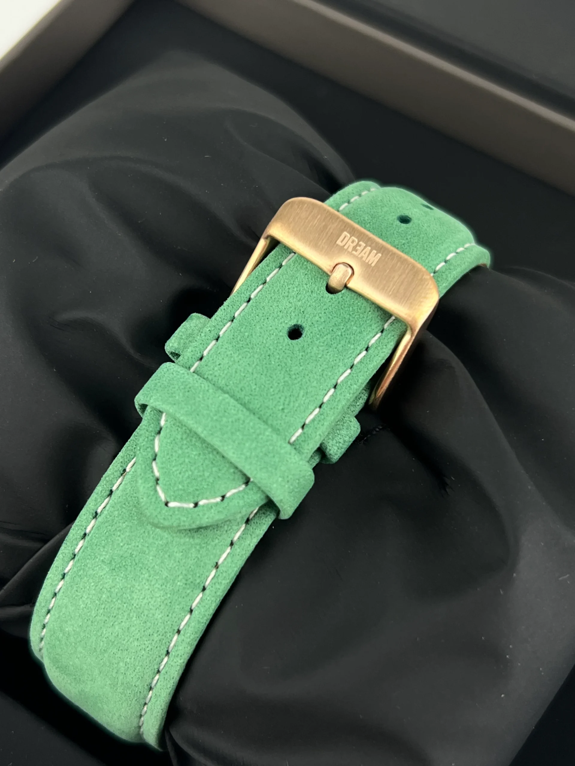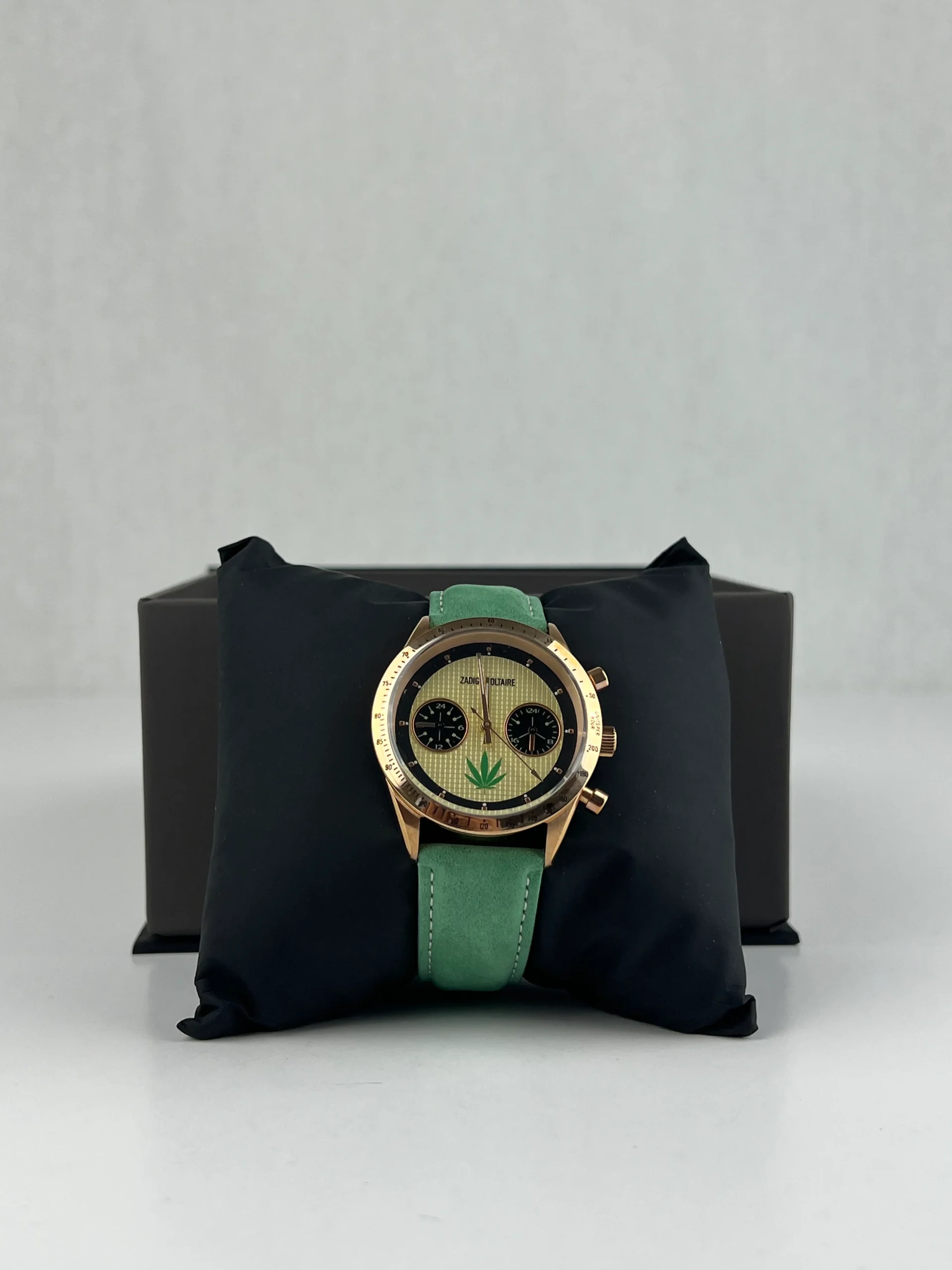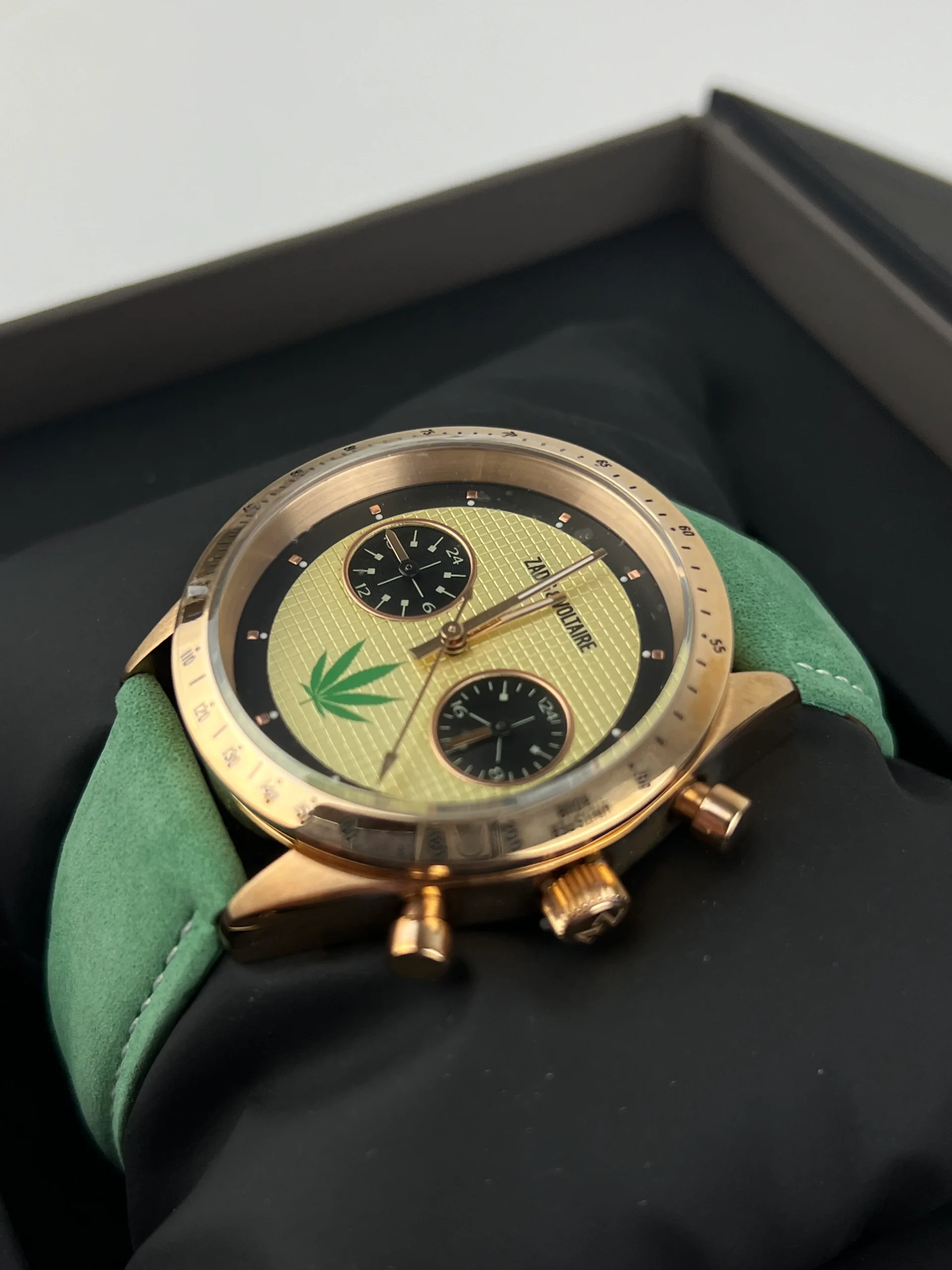 Montre de la marque Zadig & Voltaire. Matière: Acier Inoxydable Or Rose Bracelet: Denim Vert Diamètre: 42mm